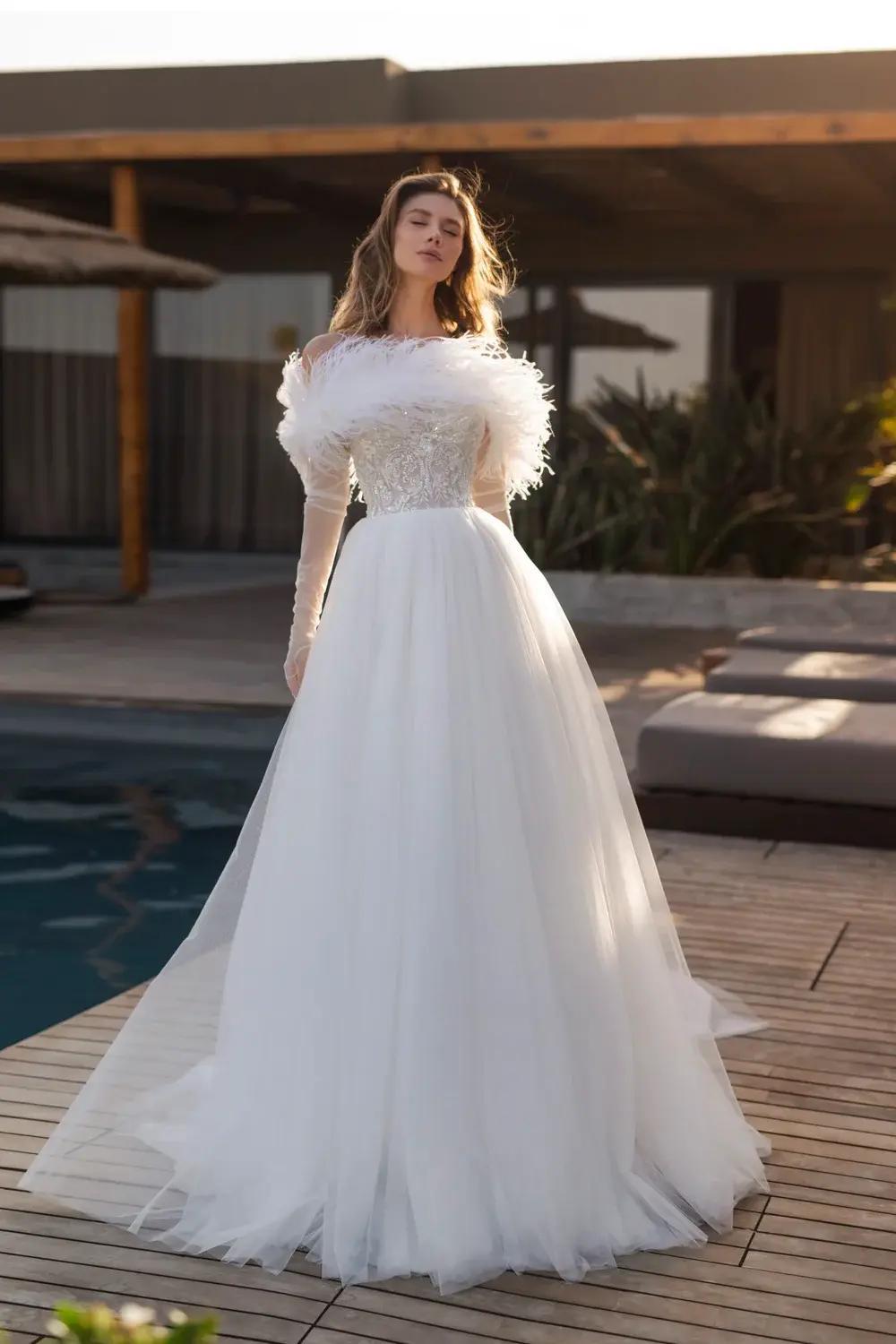 Пожалуй, самый зимний вариант из всех.Белоснежные перья придают ему сказочное очарование, словно платье только что спустилось с небесного бала. Они мягкие, теплые, красиво колышутся при каждом движении и великолепно смотрятся на фотографиях. Главное — не переборщить: пусть перья украшают только подол, рукава или лиф. Так платье останется элегантным, а не превратится в карнавальный костюм.