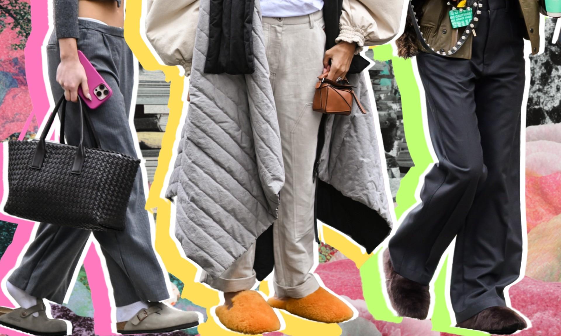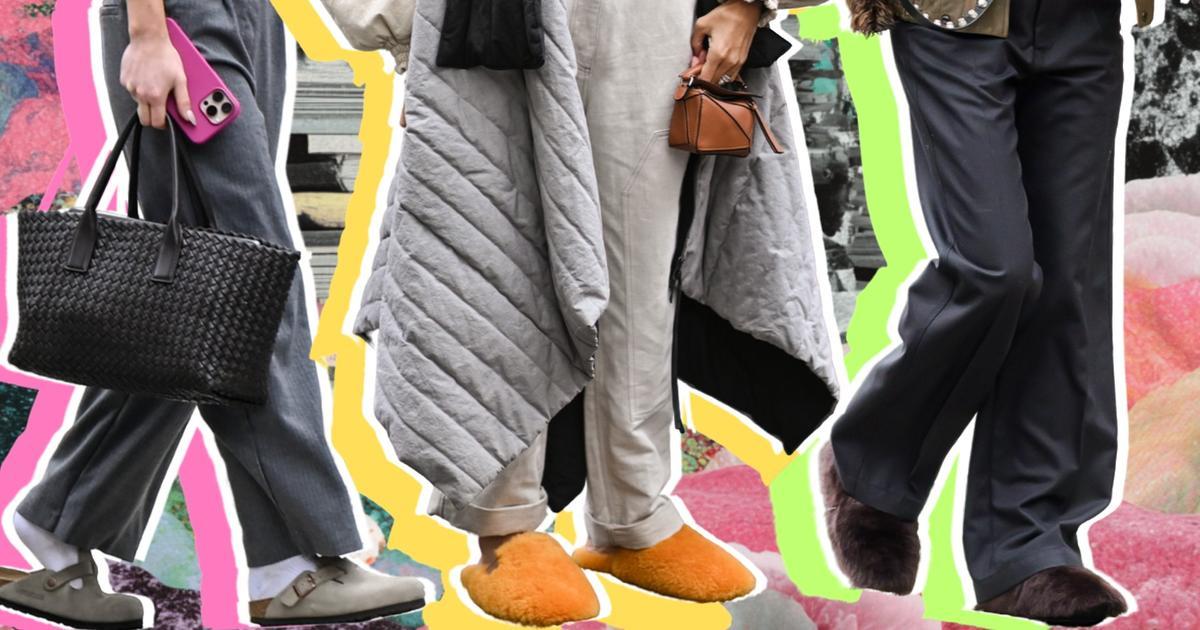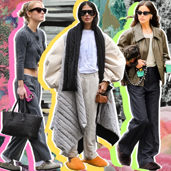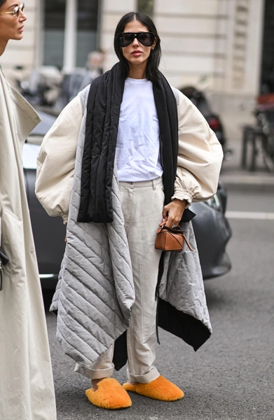 Мягкие, бесформенные тапочки идеально работают в паре со строгими, структурированными предметами гардероба. Попробуй надеть их с прямыми классическими брюками из хорошей шерсти, пальто четкого кроя или с оверсайз-пиджаком. Этот контраст — между официальным верхом и расслабленной обувью — и создает ту самую современную, непринужденную элегантность.