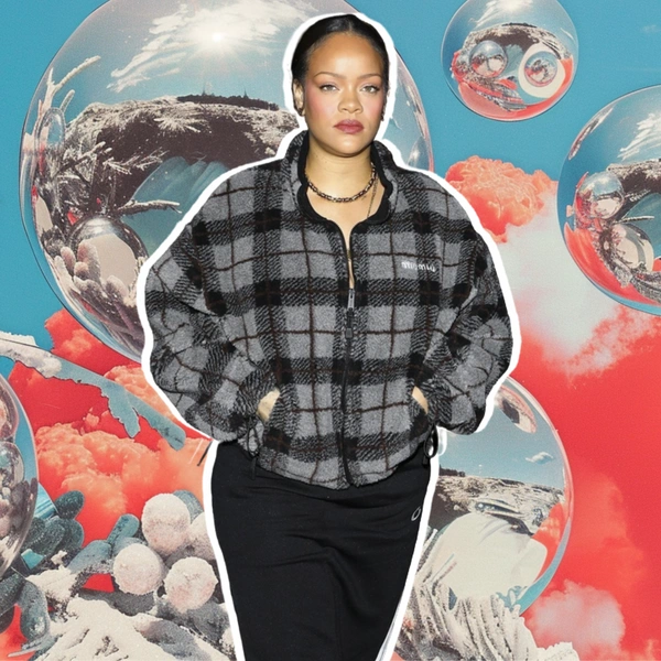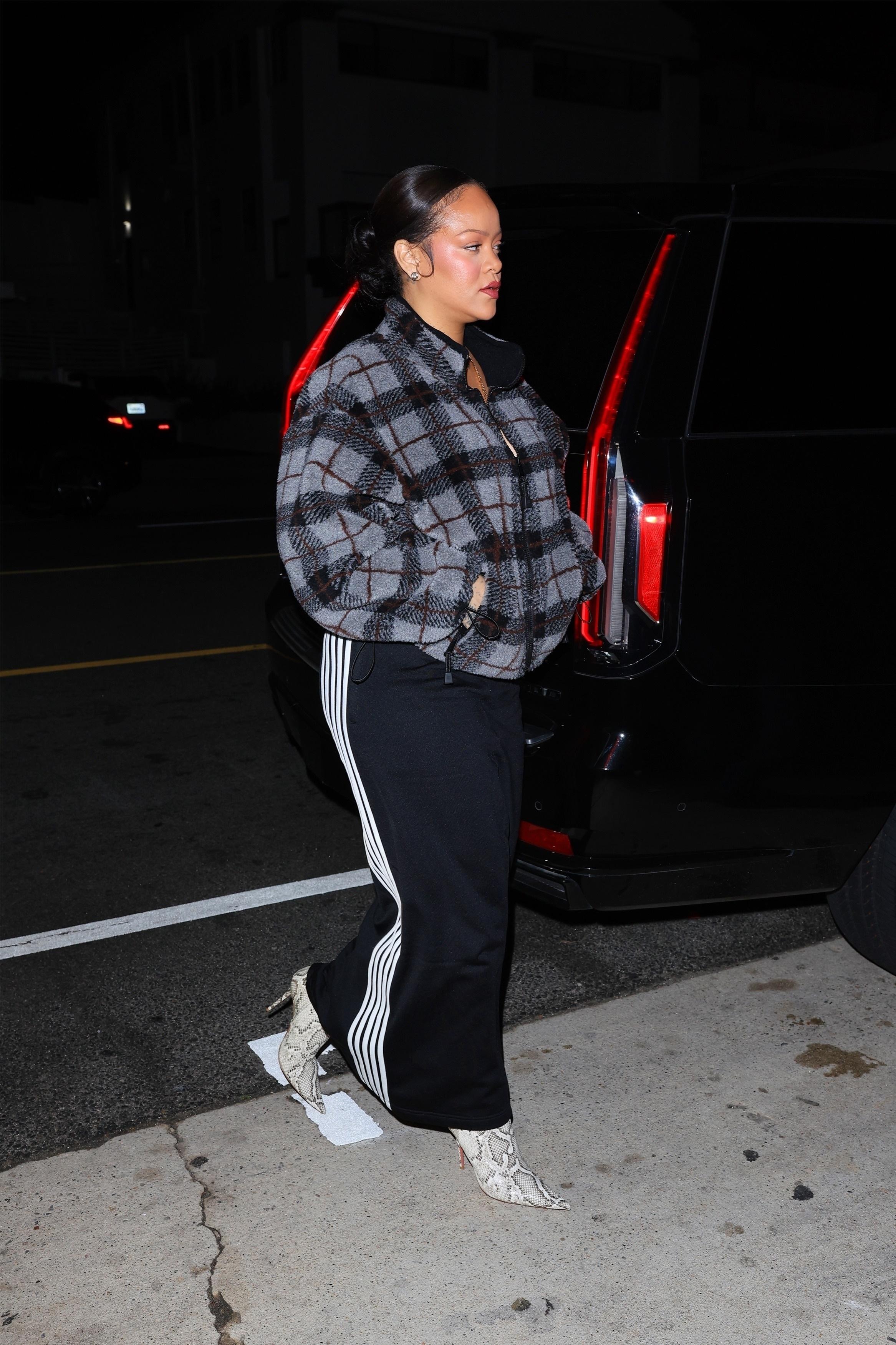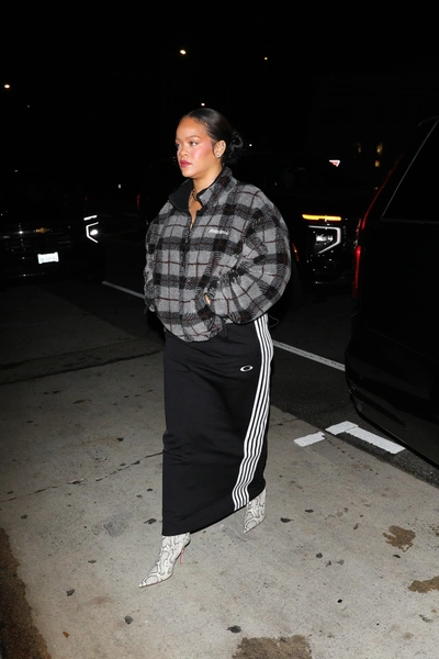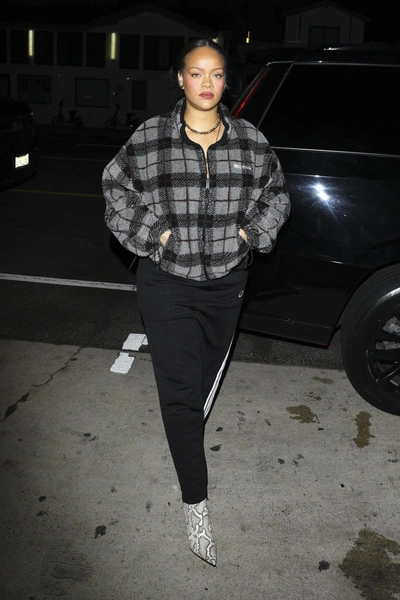 Верх Рианна выбрала неожиданно теплый и уютный: клетчатую фетровую куртку, которая добавила образу объема и слегка приглушила спортивный настрой. За счет этого сочетание получилось многослойным и живым — не слишком расслабленным, но и без излишней нарядности. А дальше началась та самая бескомпромиссная игра на контрастах, за которую ее стиль любят миллионы.