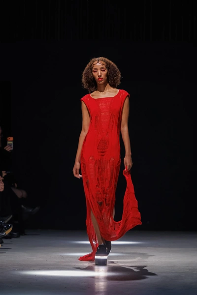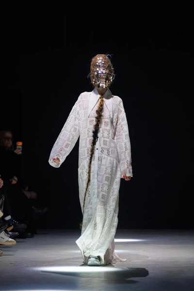 Эффекты, будто вещь начала распускаться по ниткам, стали одной из самых заметных тем сезона. Разлохмаченные края, швы наружу, асимметрия, неровные подолы — все это создает ощущение незавершенности и процесса. Берлинские дизайнеры не боятся показывать одежду «в работе», подчеркивая идею движения и изменений.