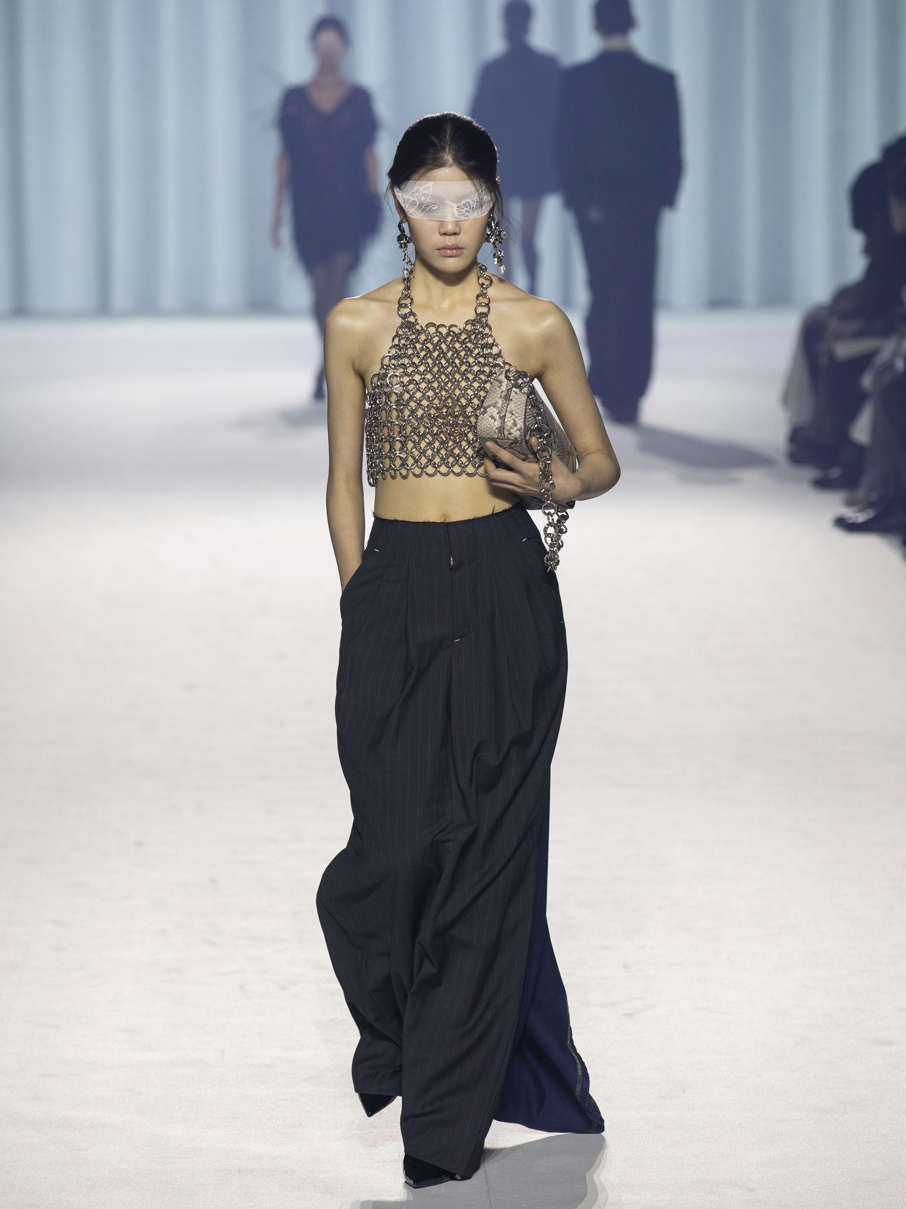 И, наконец, главный акцент показов — топы, сплетенные из металлических колец, напоминающие древние кольчуги. Это безусловный маст-хэв сезона для тех, кто не боится привлекать внимание. На подиуме их демонстрировали на голое тело, и выглядело это футуристично и мощно. Однако в реальной жизни такой топ можно надеть поверх простой футболки или тонкого водолазного топа — так ты получишь нужный эффект, избежав прямого контакта прохладного металла с кожей.