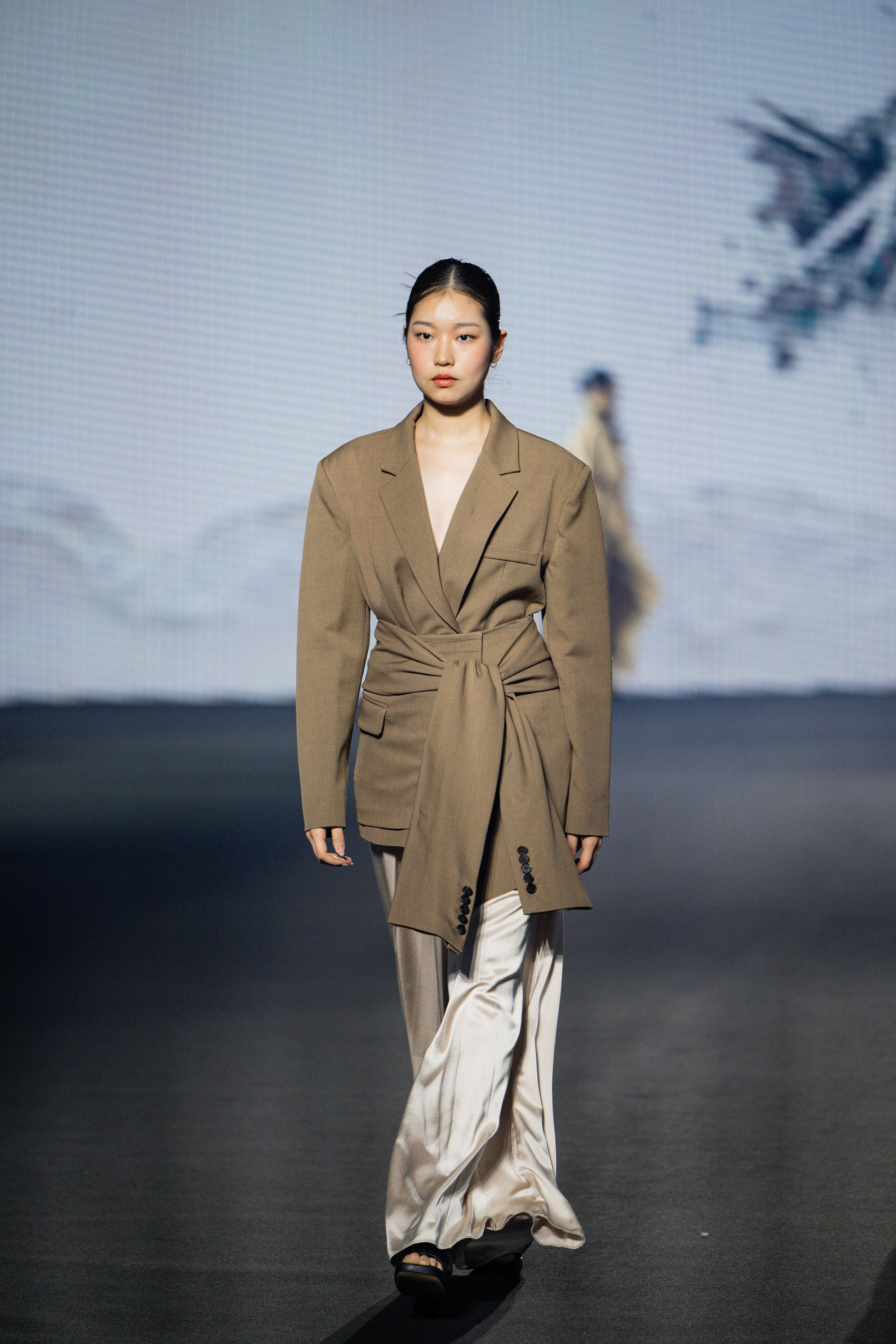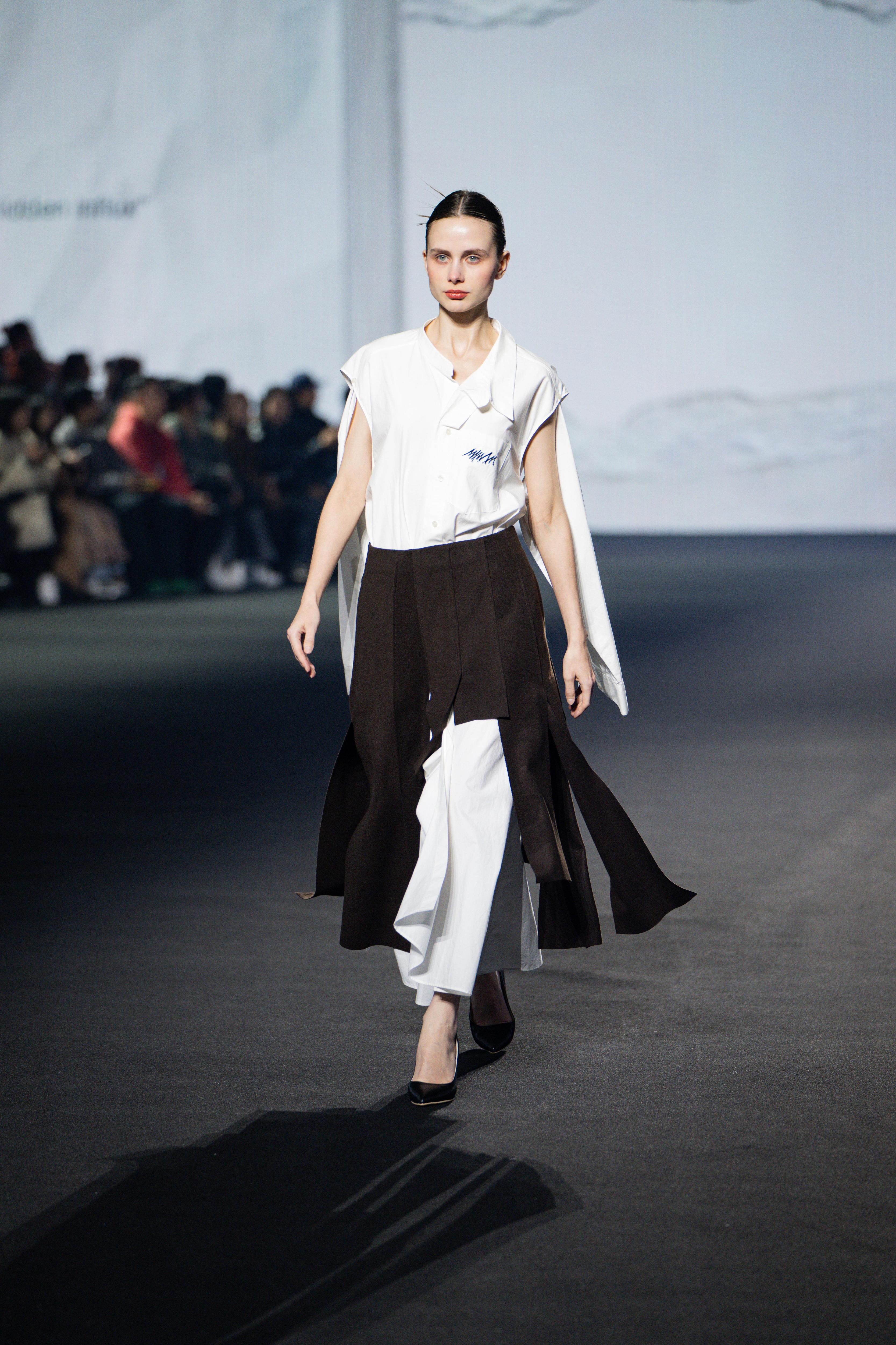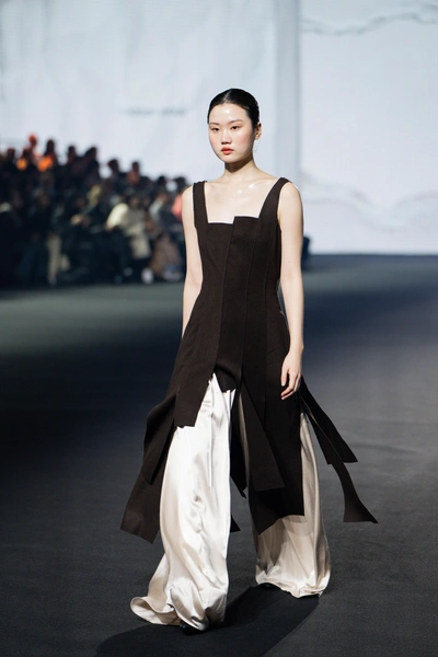 Сочетание, которое еще недавно казалост смелым экспериментом, теперь утвердилось как одна из базовых формул сезона. Но корейские дизайнеры добавили в него свою изюминку. Главное правило — игра на контрасте. Поверх широких, часто шелковистых или струящихся брюк надевают платье с асимметричным подолом. Край юбки может быть неровным, «рваным», смещенным вбок или укороченным спереди, открывая брюки. Очень эффектно смотрится, например, лук с подиума с плотным платьем глубокого коричневого оттенка с неровным краем в паре с широкими жемчужно-серыми шелковыми брюками. Этот прием создает невероятную пластику движения и объем.
