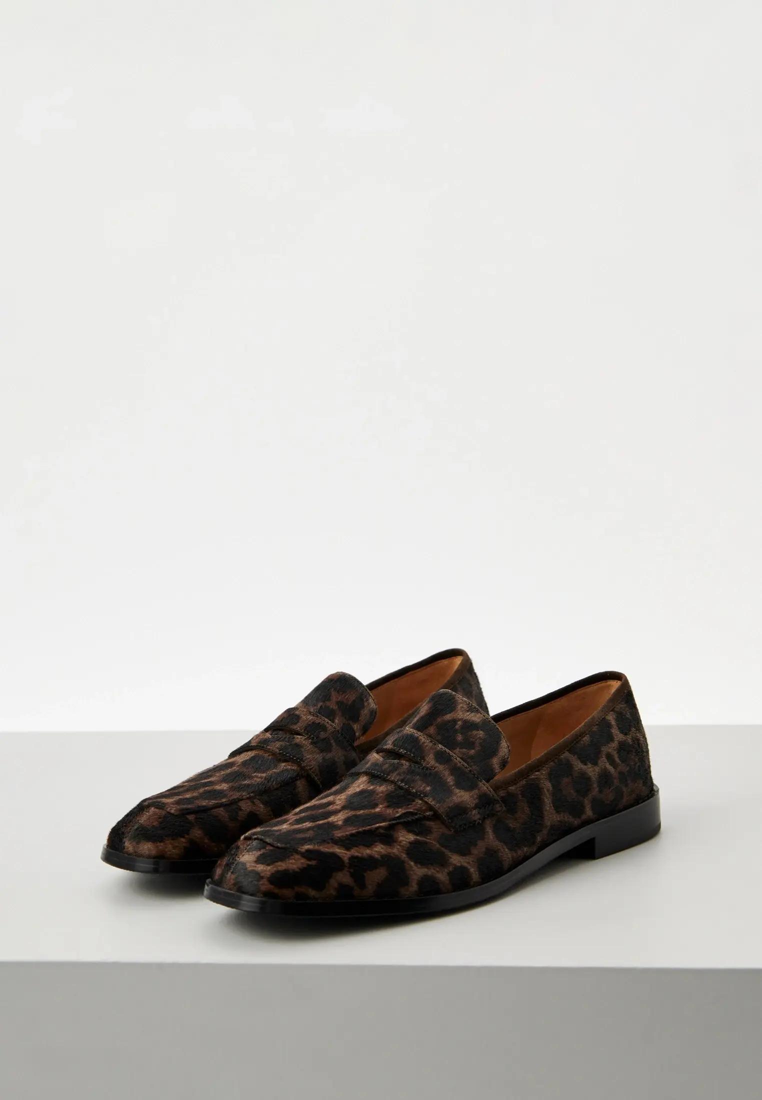 Тем, кому классические лоферы кажутся слишком очевидным выбором, дизайнеры предлагают альтернативу — модели с животным рисунком. Безусловный фаворит — леопард. Он больше не воспринимается как что-то вызывающее и легко работает даже в спокойных образах. Такие лоферы лучше всего сочетать с нейтральной одеждой, позволяя обуви играть главную роль.
