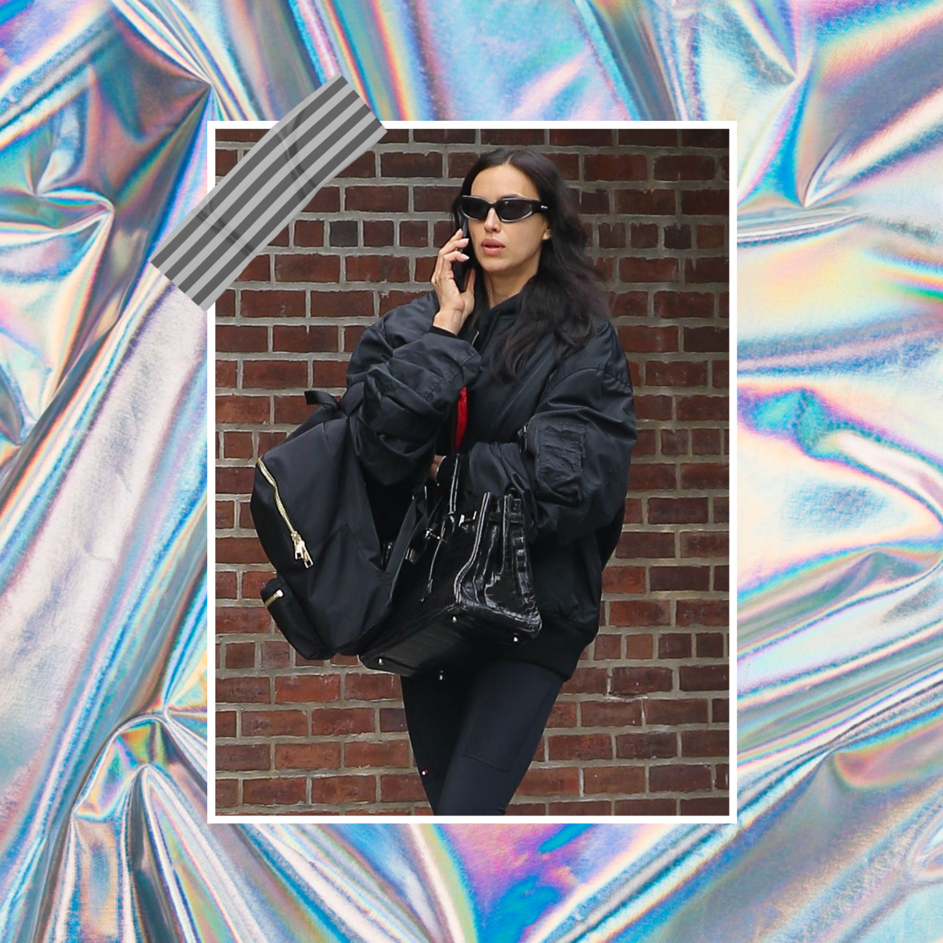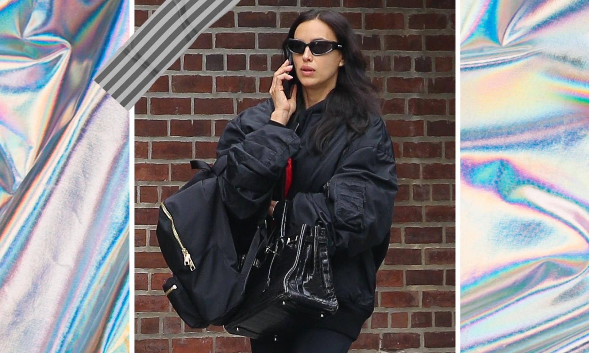Свободный силуэт и чуть грубоватый крой создают уравновешенный контраст с изящными деталями, на которых модель делает акцент. На одном предплечье у Ирины висел черный рюкзак, а на другом — структурированная сумка с глянцевым крокодиловым тиснением. Этот прием — сразу две сумки в одном образе — давно закрепился в стритстайле, и Ирина демонстрирует, как сочетать практичность и моду без лишней вычурности.