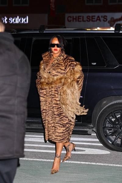 Однако, пожалуй, самый громкий выход принадлежит Рианне. В том же Нью-Йорке ее заметили в полноценном тигровом тотал-луке. Вместо привычных джинсов — коричневая шуба Alaïa с принтом под тигровую шкуру. Плотная фактура, выверенный крой и глубокий вырез сделали ее центральным элементом образа. Под шубой — как будто ничего, что добавило напряжения и чувственности без лишней демонстративности. Завершали образ туфли на высоком каблуке с тем же тигровым рисунком — ход смелый, но предельно логичный.