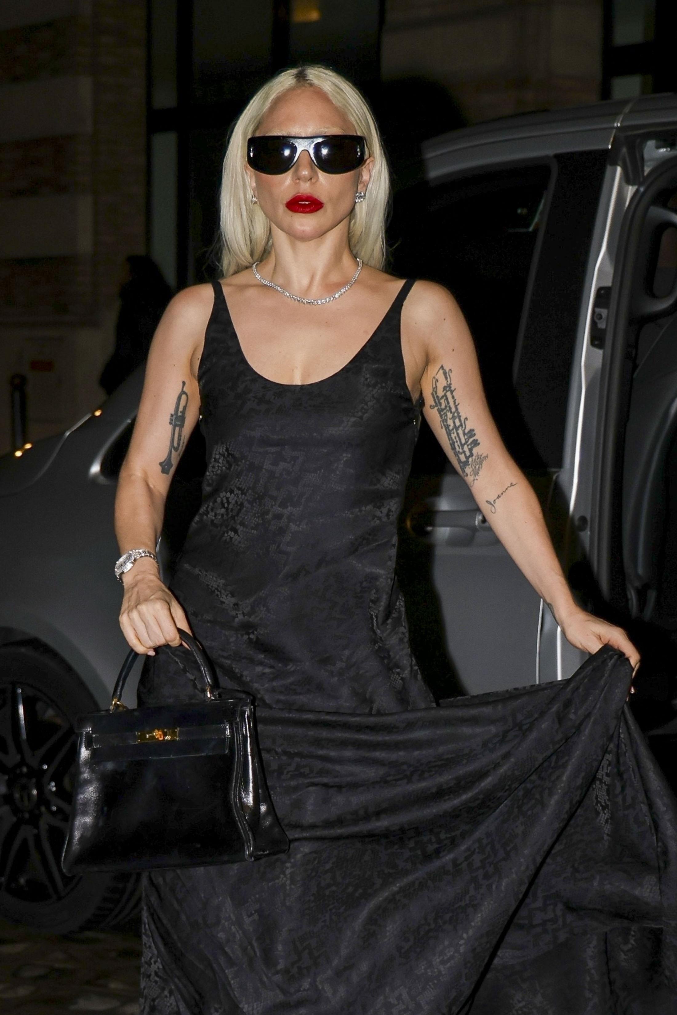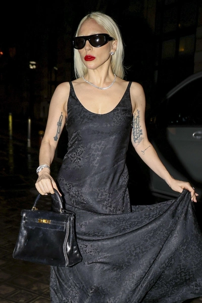 Гага направлялась в исторический парижский клуб Lapérouse в эффектном узорчатом макси-платье черного цвета, полупрозрачных колготках, бриллиантовых украшениях и крупных солнцезащитных очках, но главным элементом образа стала сумочка в руке. Легендарная Hermès Kelly с золотистой фурнитурой выглядела бы привычно — если бы не ее состояние.