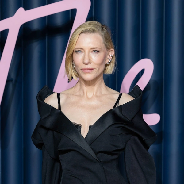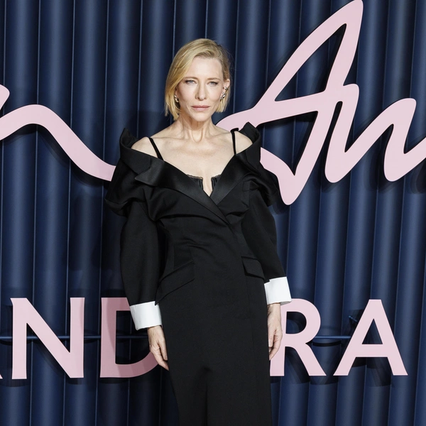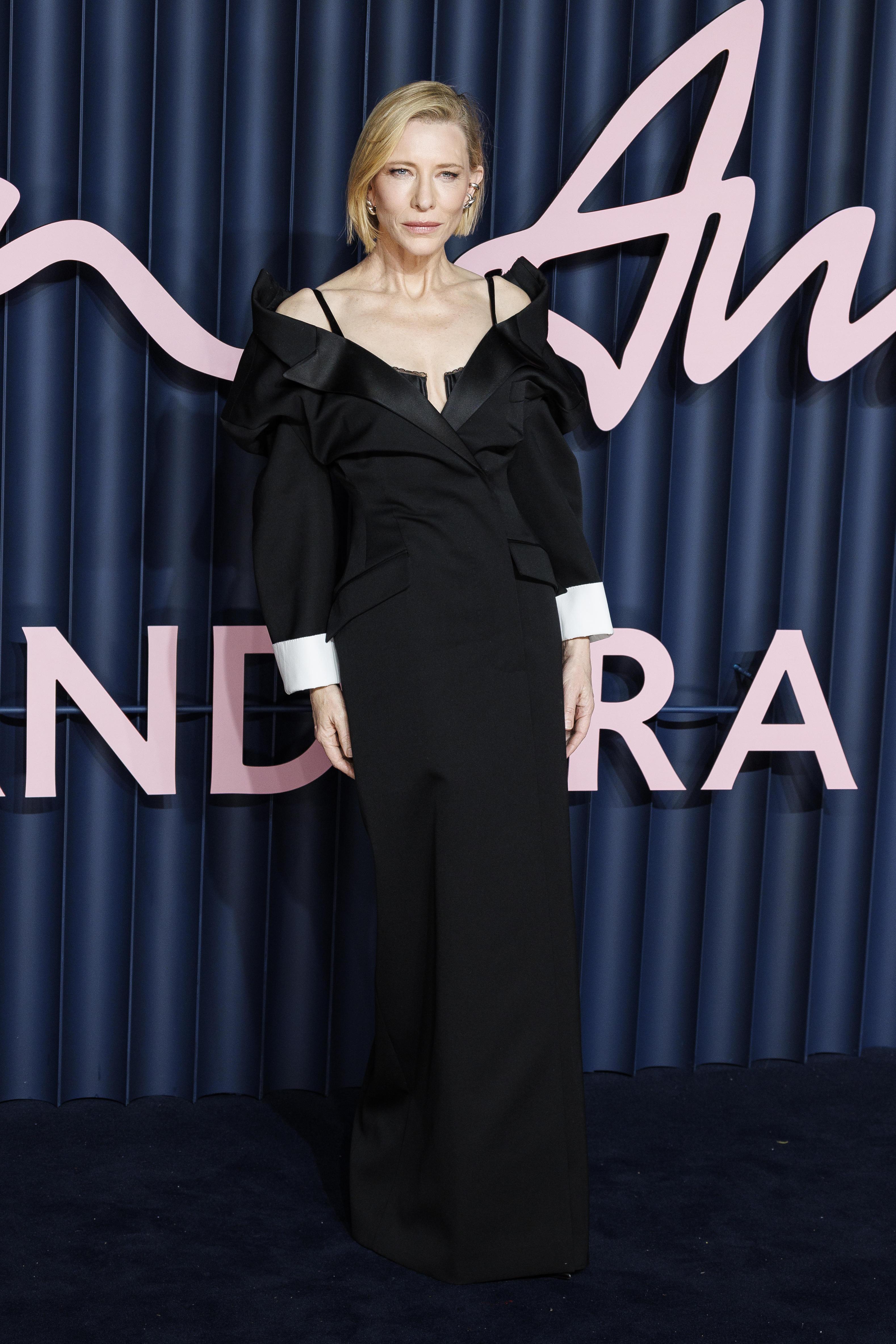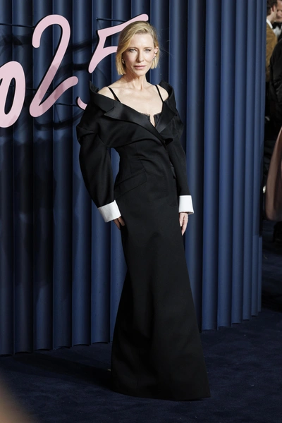 Ее образ создан Сарой Бертон для Givenchy, и это тот редкий случай, когда дизайнерское прочтение классики выглядит одновременно свежо и вечным. Платье устроено как переосмысление мужского костюма: строгий крой, приталенный силуэт, акцент на линии плеч и та самая сдержанная драматичность, которая всегда сопровождала лучшие образы Бланшетт.