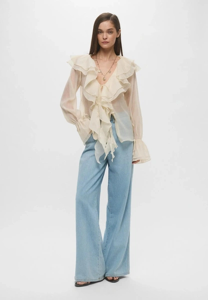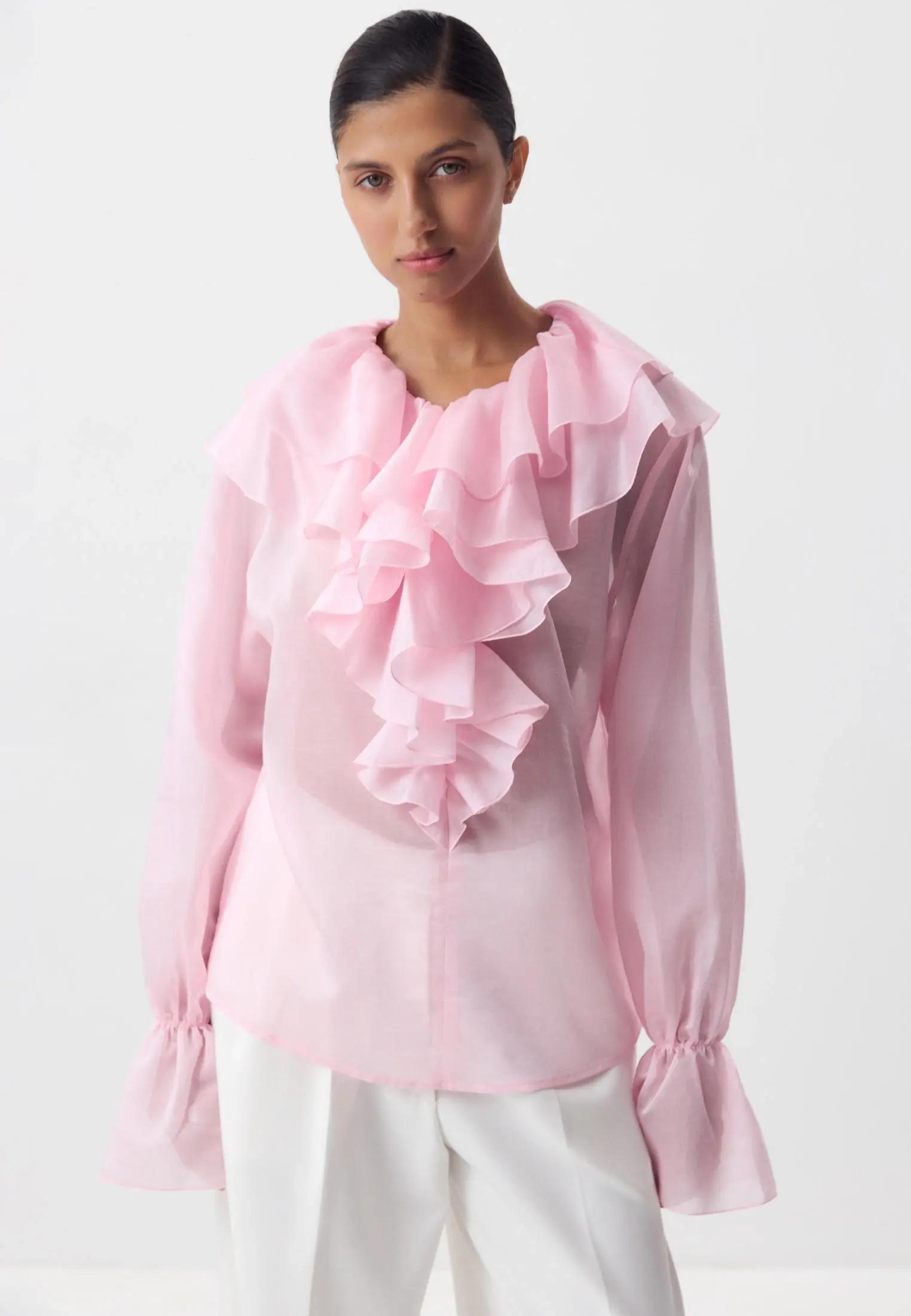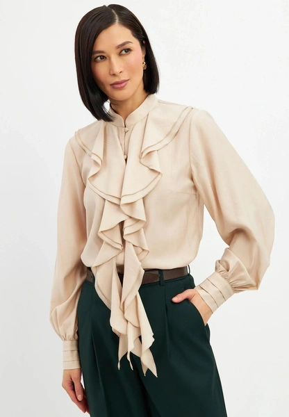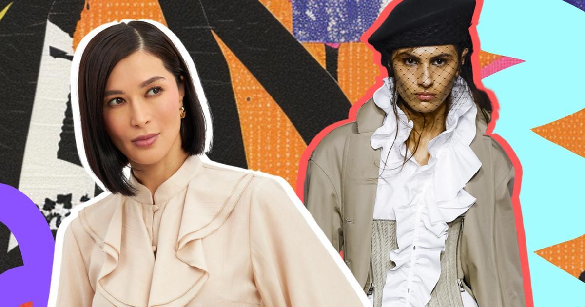 Во многом секрет успеха кокилье заключается в его способности работать как настоящая палочка-выручалочка: блузка с пышными рюшами на воротнике меняет пропорции, добавляет объема в верхней части образа и делает лицо визуально более открытым и мягким. Когда в гардеробе много базовых свитеров, рубашек и нейтральных оттенков, крупный воротник становится простым способом выделиться без лишних усилий.