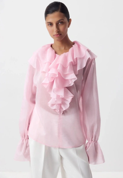 Кроме того, пышные рюши идеально вписываются в предновогодний сезон: они задают настроение даже в сочетании с темными пиджаками, пальто и плотными тканями. Мягкая винтажная эстетика давно стала важной частью современной моды, и кокилье продолжает эту линию: рюши добавляют нужную долю романтики, но без избыточной декоративности.