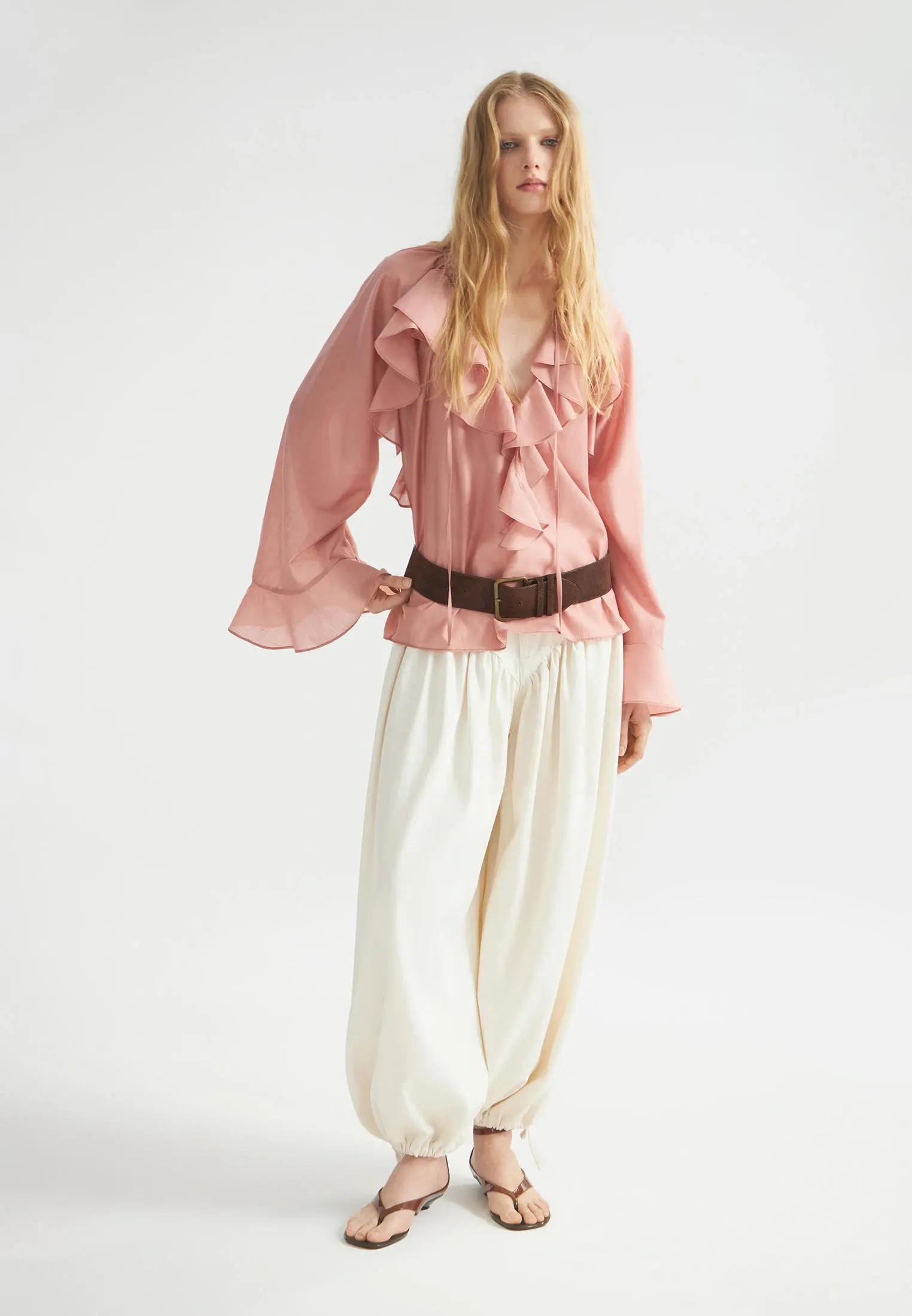 К тому же рюши в целом стали частью новой богемной волны, которая заметна в коллекциях начиная с 2024 года. Они слишком красиво работают в движении и слишком хорошо сочетаются с современным базовым гардеробом, чтобы уйти через сезон.