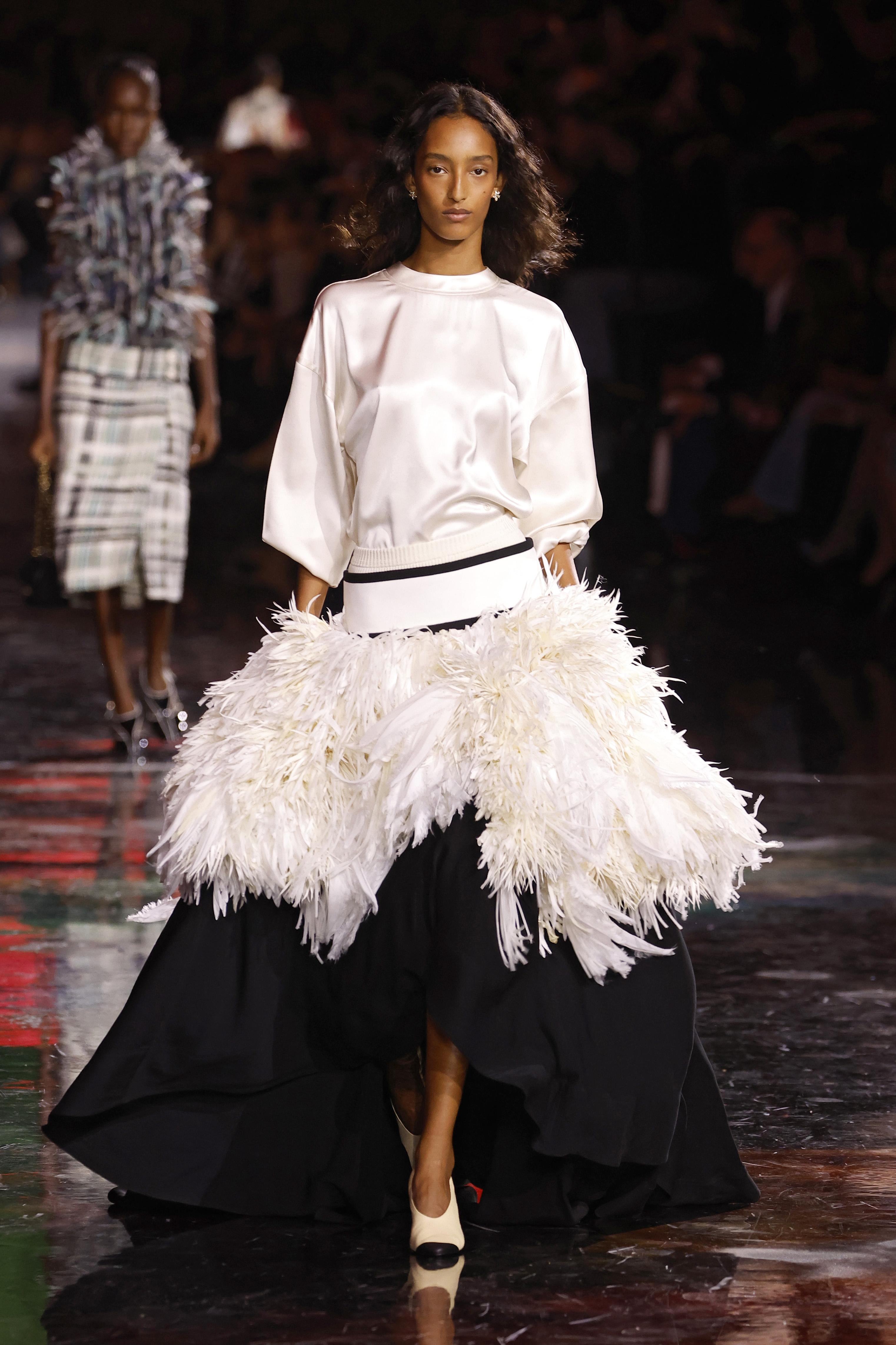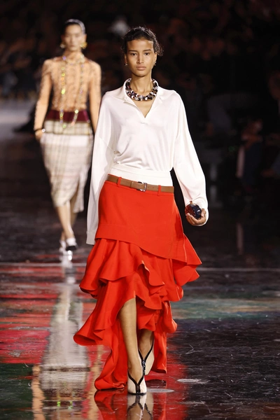Юбка-солнце или трапеция, летящая от талии, — воплощение весенней энергии. Она скрывает недостатки и подчеркивает талию, создавая узнаваемый и женственный силуэт. Некоторые дизайнеры добавляют к этому фасону перья или сложные аппликации, поднимая его на новый уровень.