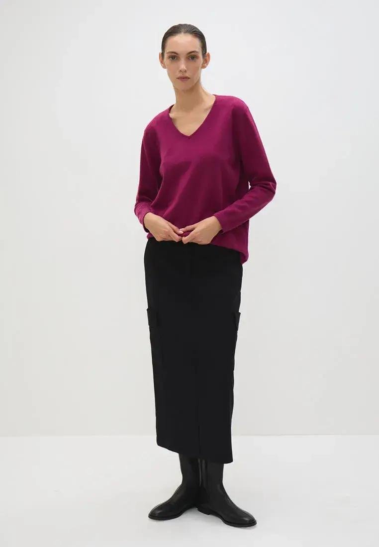 V-образный вырез делает любой образ визуально стройнее и легче, вытягивая силуэт. Он красиво открывает ключицы и шею, но при этом остается практичным — не требует дополнительных слоев или сложной стилизации.