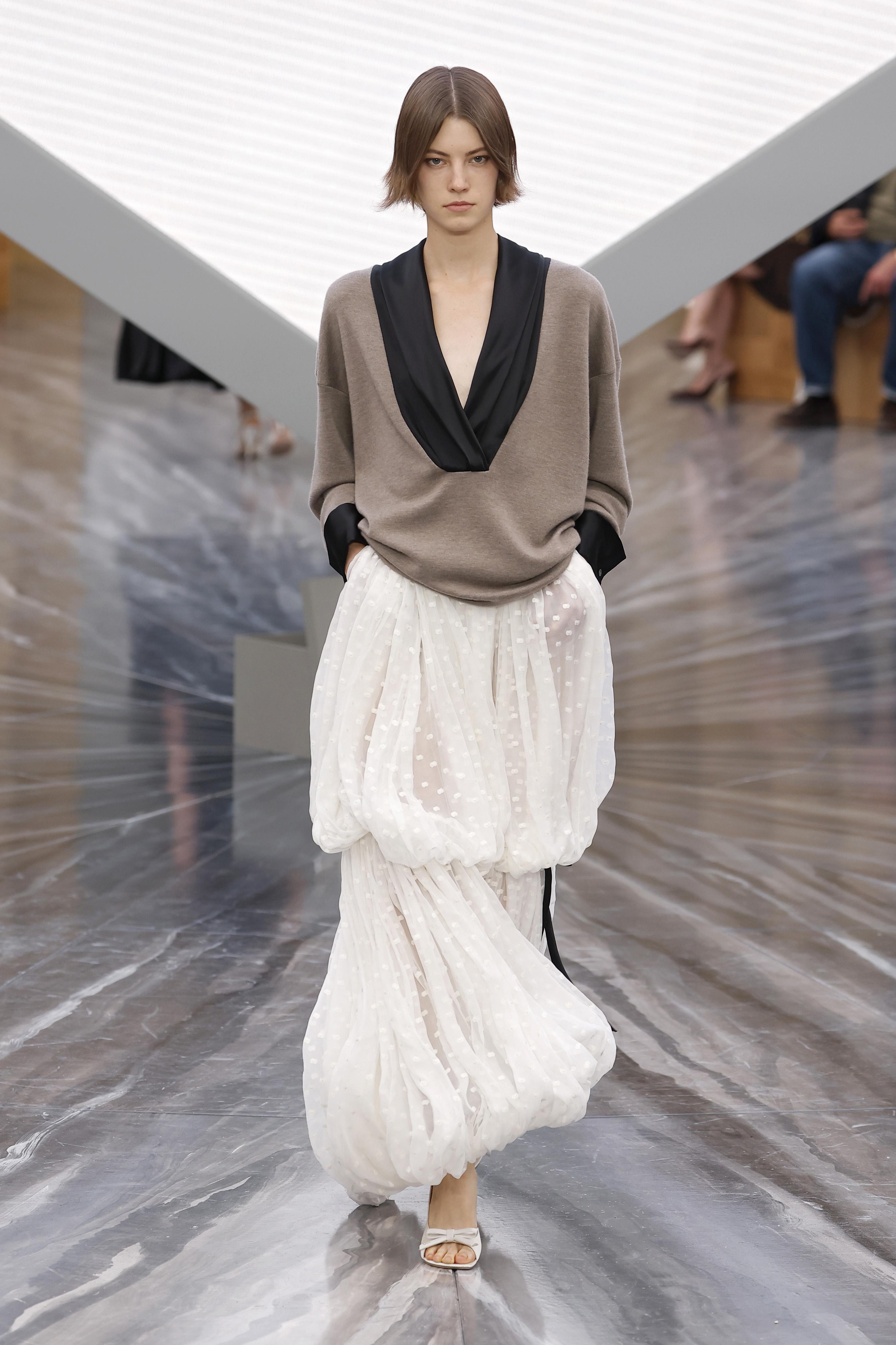 А вот в дебютной женской коллекции Джонатана Андерсона для Dior совсем другое настроение: уютный пуловер цвета овсянки с глубоким вырезом сочетался с полупрозрачной белой макси-юбкой в горошек. Получился образ одновременно женственный и академичный.