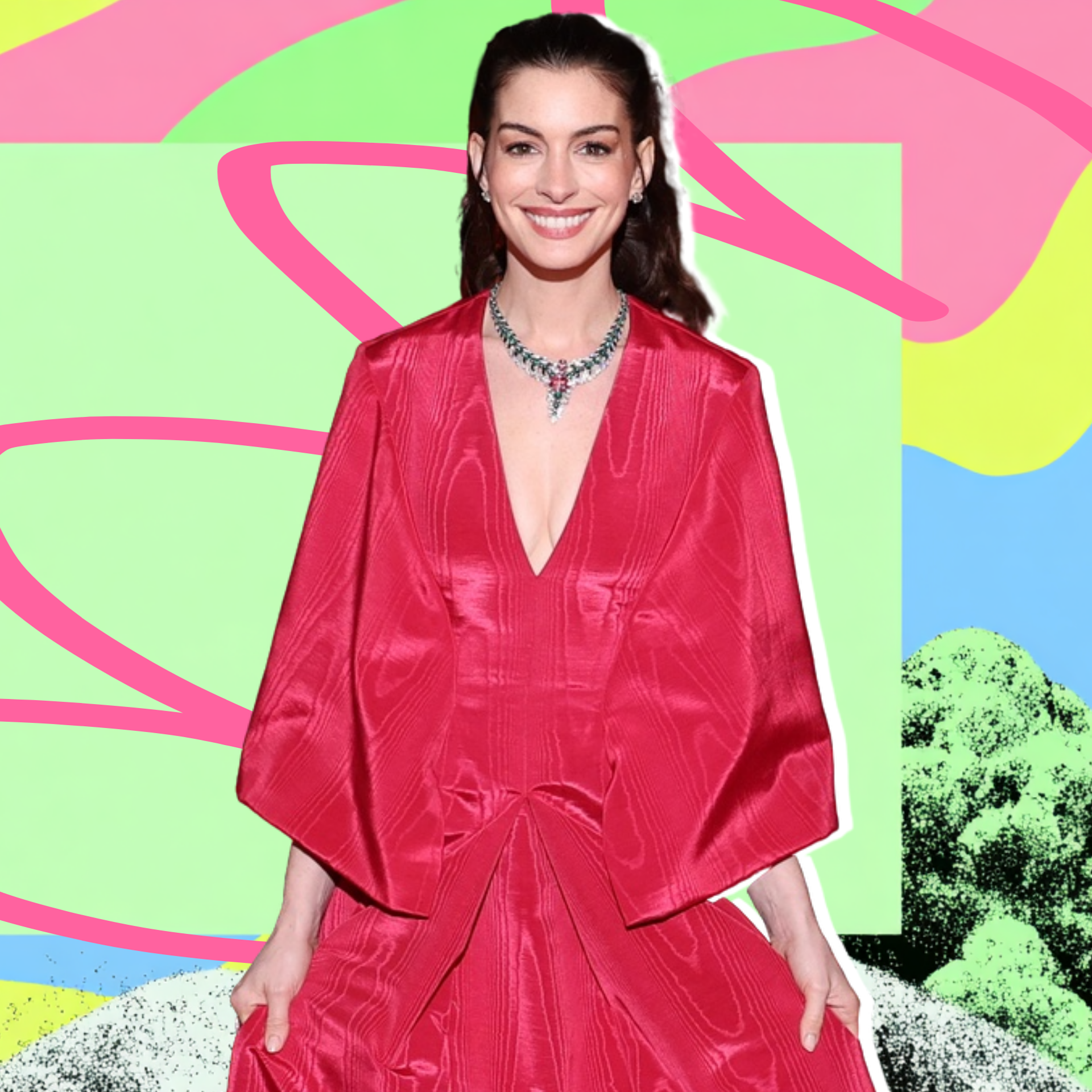 Модель в пол с глубоким V-образным вырезом, широкими рукавами, имитирующими накидку, и объемной юбкой. Вертикальные полосы из переливающейся ткани создавали игру света и тени, а пышный подол эффектно ниспадал на кремовую ковровую дорожку, по которой актриса шла к главному входу. Цвет маджента, один из самых ярких оттенков сезона, на Энн смотрелся особенно выигрышно — он подчеркивал и аристократичную белизну ее кожи, и блеск волос, и уверенность, с которой она держалась, и ее неугасающее внутреннее сияние.