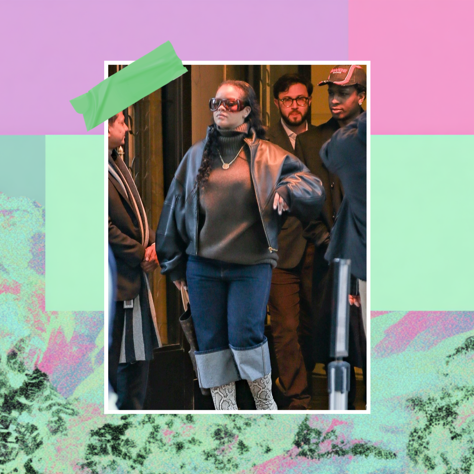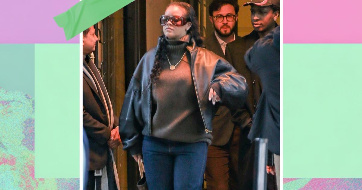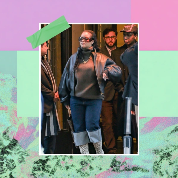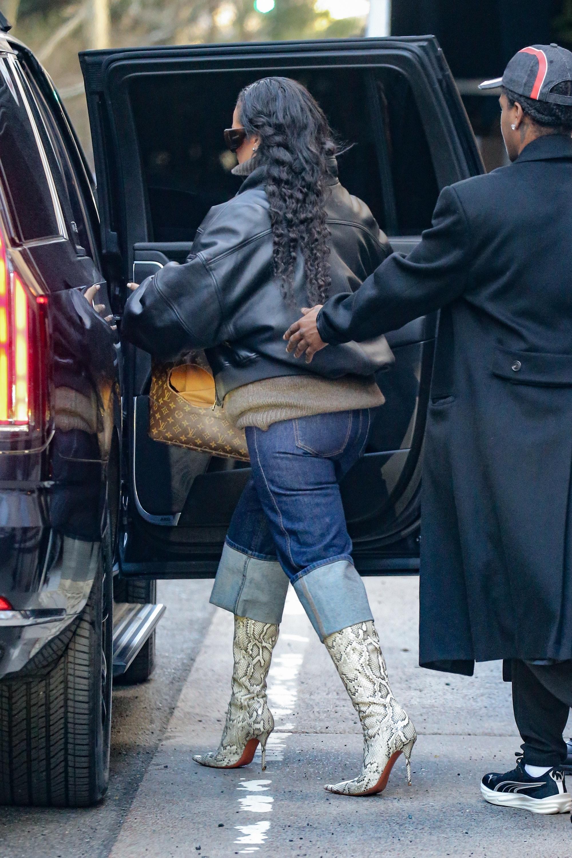 Верхнюю часть образа Рианна выдержала в спокойном настроении, надев объемный бежевый свитер с трендовым воротником-стойкой, а поверх него — укороченную черную кожаную куртку, которая балансирует пропорции. Единственное яркое пятно здесь — массивный золотой кулон, лежащий прямо поверх свитера, что сейчас очень модно. Крупные, чуть футуристичные солнцезащитные очки Howl от Saint Laurent добавили легкой загадочности, а классическая, без лишнего декора сумка Louis Vuitton с той самой узнаваемой монограммой завершили образ.
