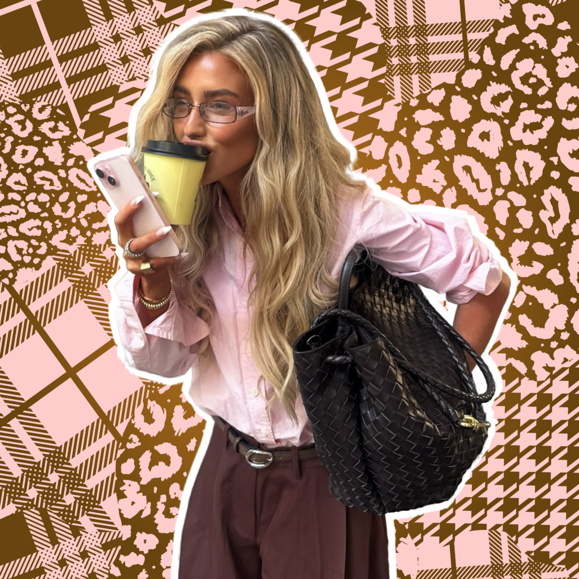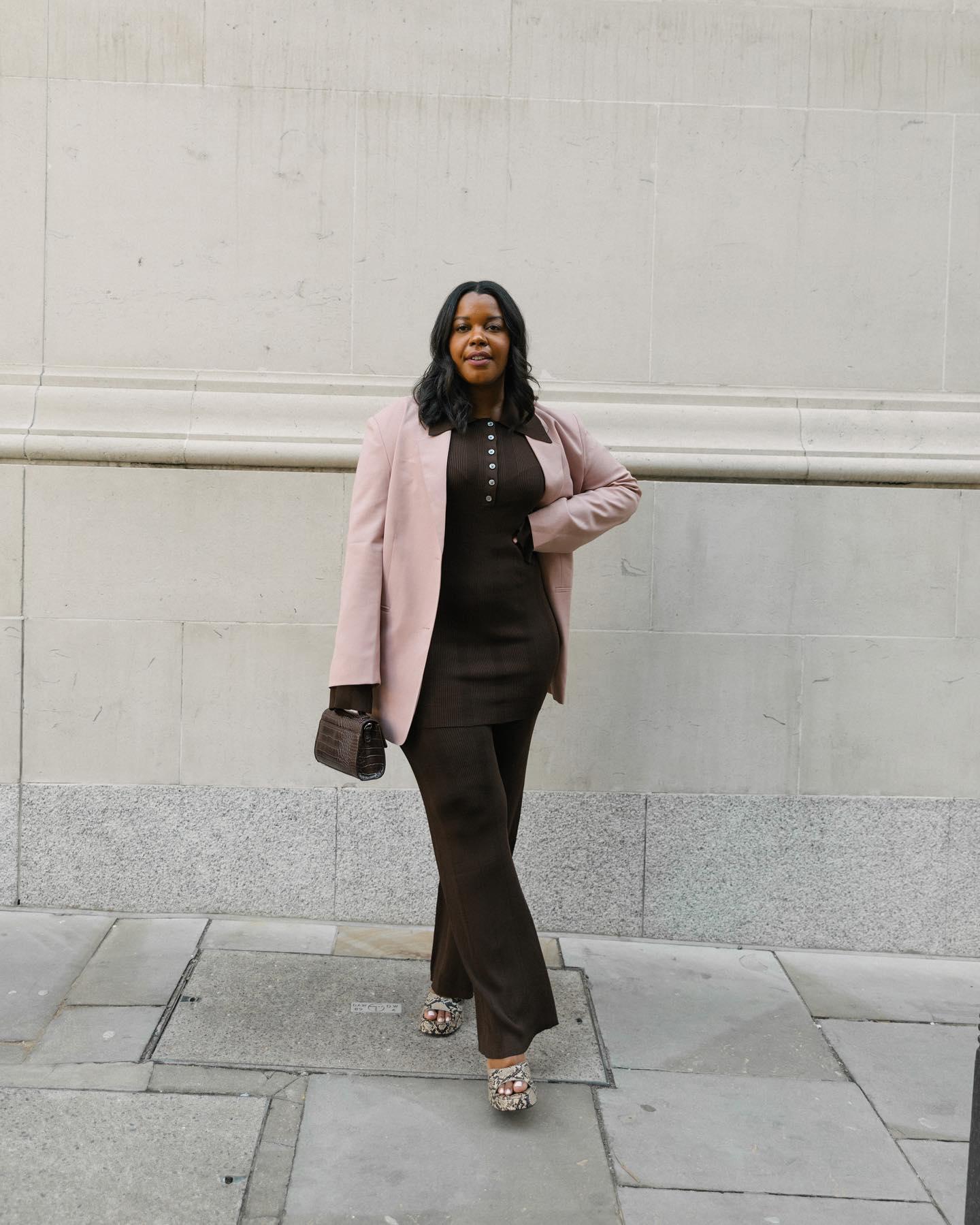 Если хочешь начать осторожно знакомиться с этим сочетанием, начни с аксессуаров. Коричневая сумка прекрасно «заземляет» розовые оттенки и делает образ более цельным.