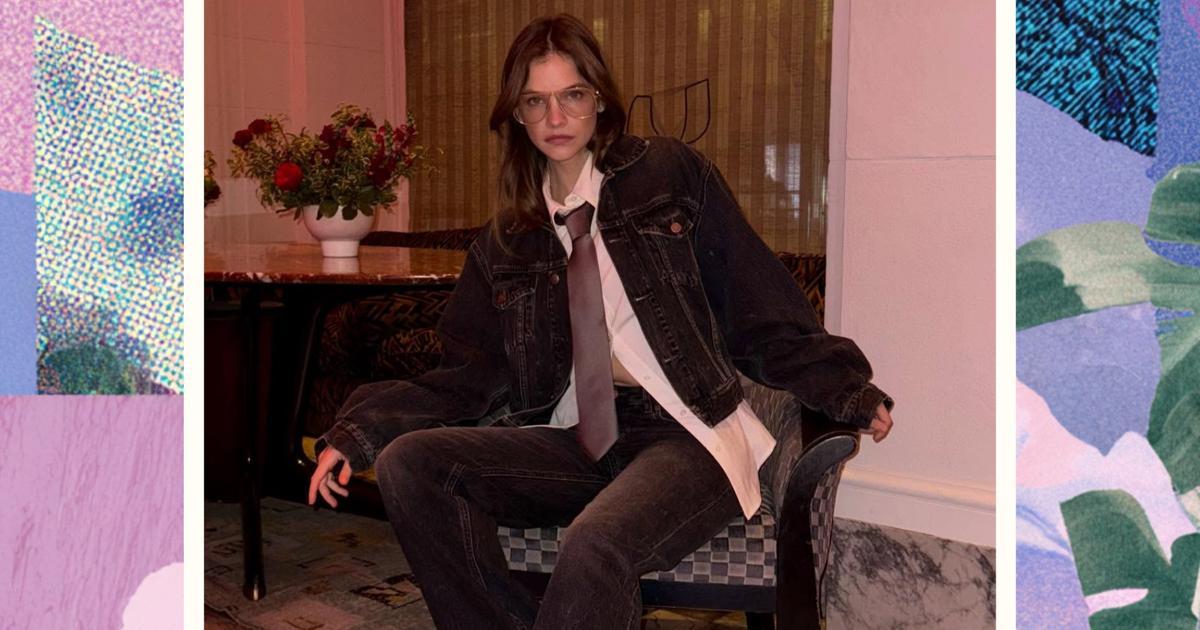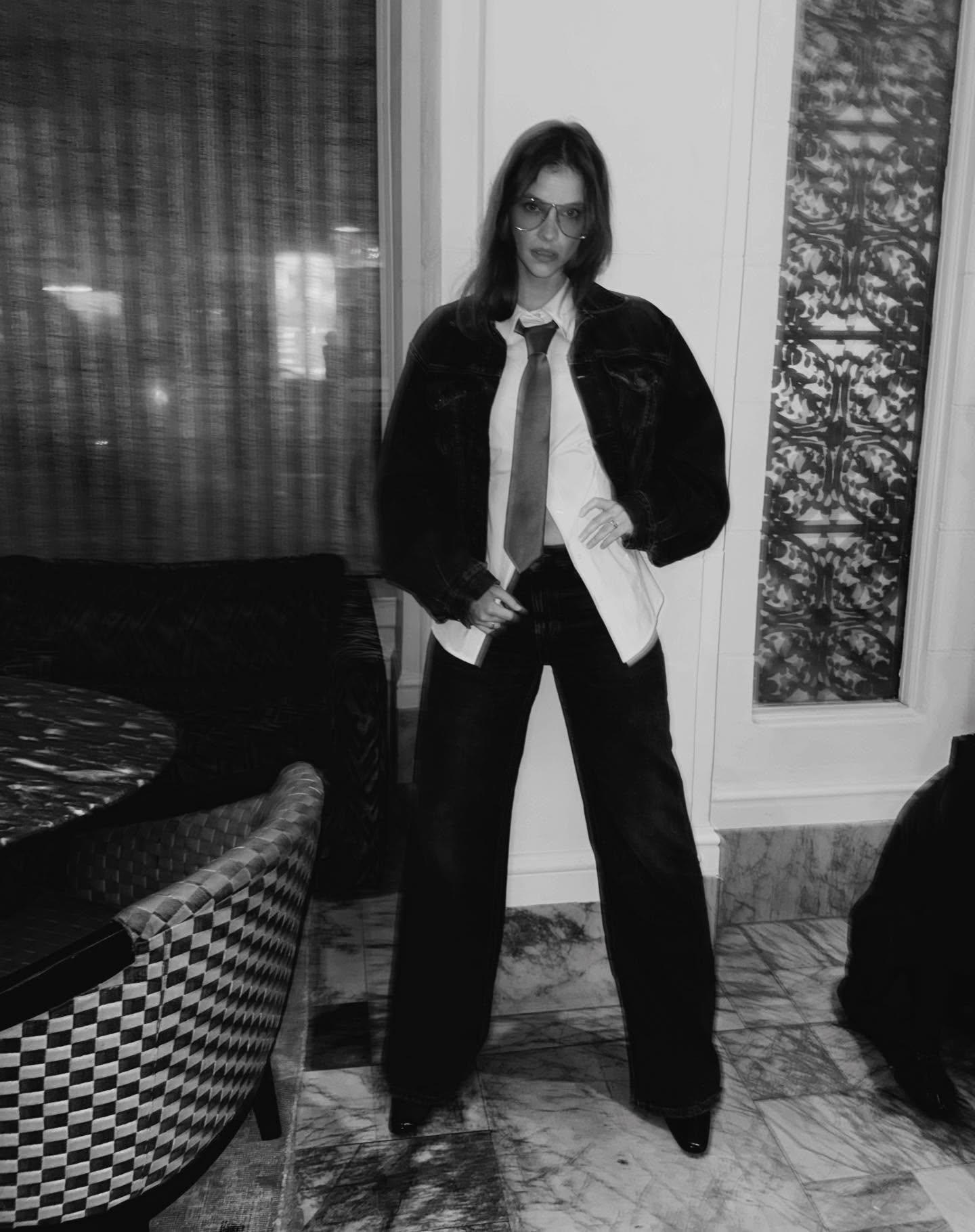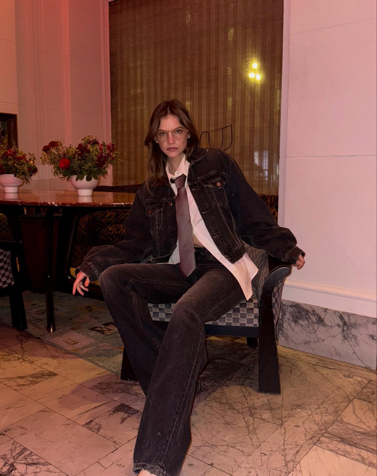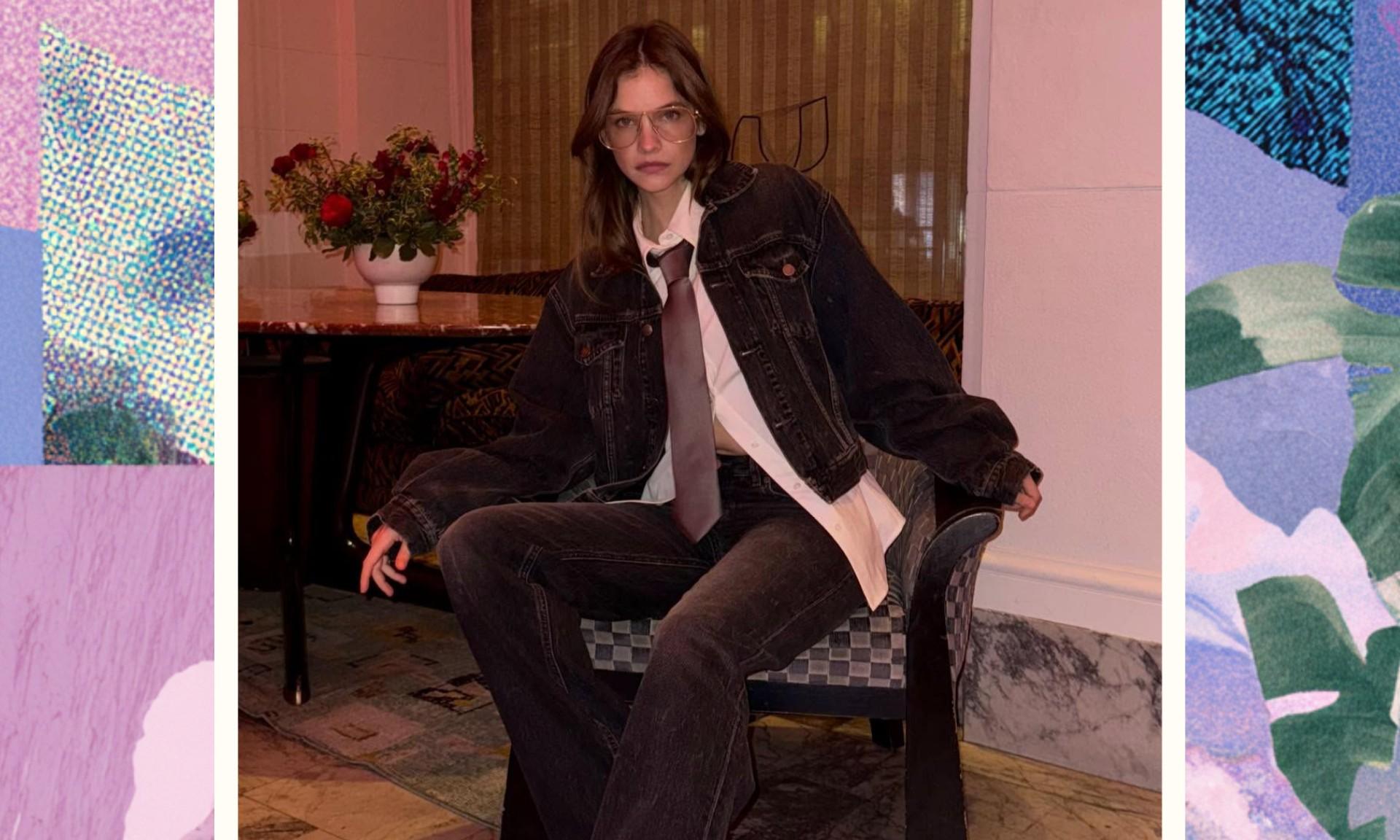 Этот новый образ Барбары — идеальная иллюстрация, как работает современная мода. Она берет самый простой набор элементов — рубашку, галстук, джинсы, куртку — и пересобирает их так, что они перестают быть скучными. Секрет в трех вещах. Первая — незастегнутая рубашка: простой прием, который мгновенно снимает с вещи налет официоза. Вторая — расслабленный галстук: не затягивай и не выравнивай его, если возьмешься создавать подобный аутфит. И третья — правильный деним: выцветший, почти потерявший свой первоначальный цвет, работает как идеальный нейтральный фон для любых экспериментов.