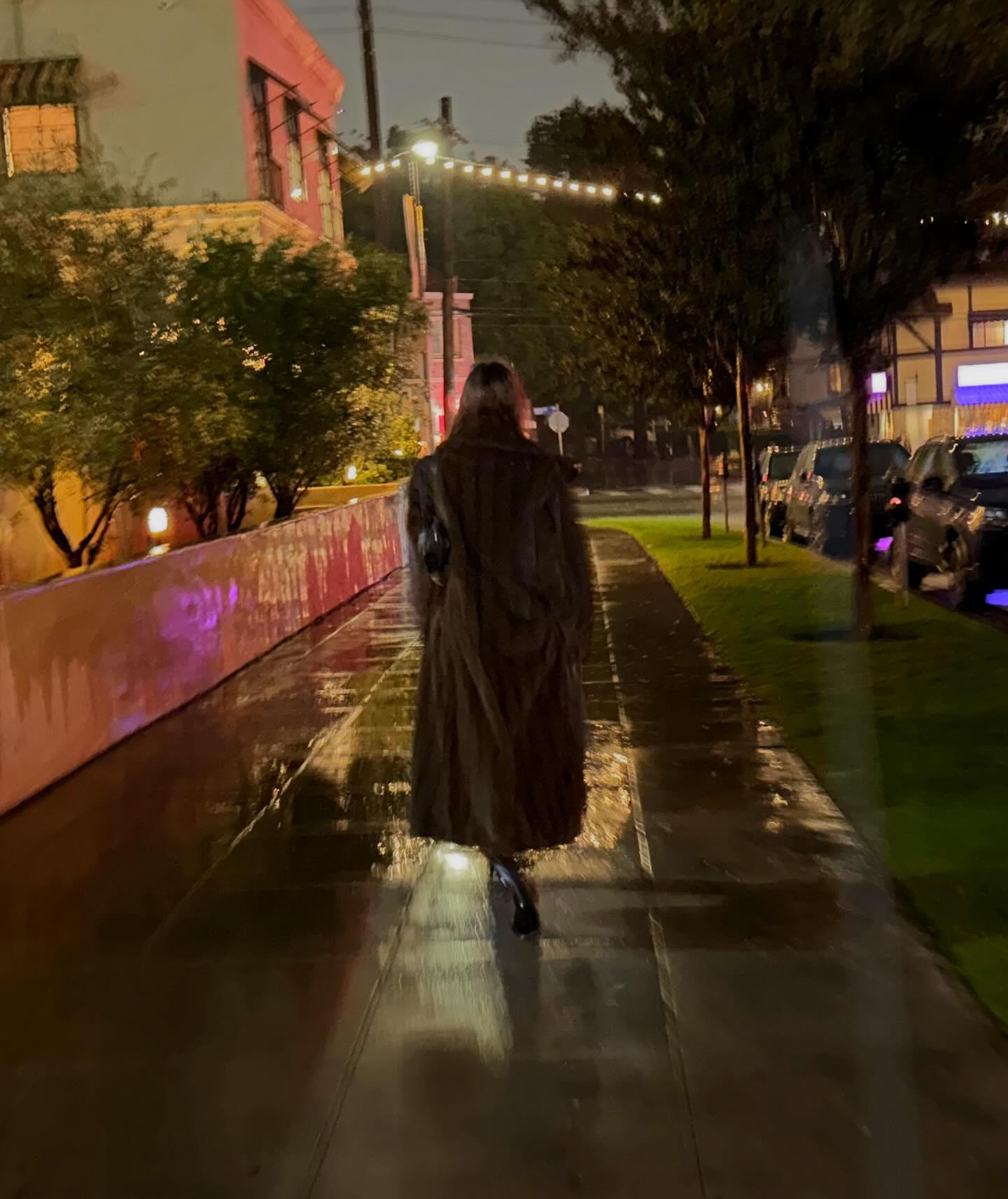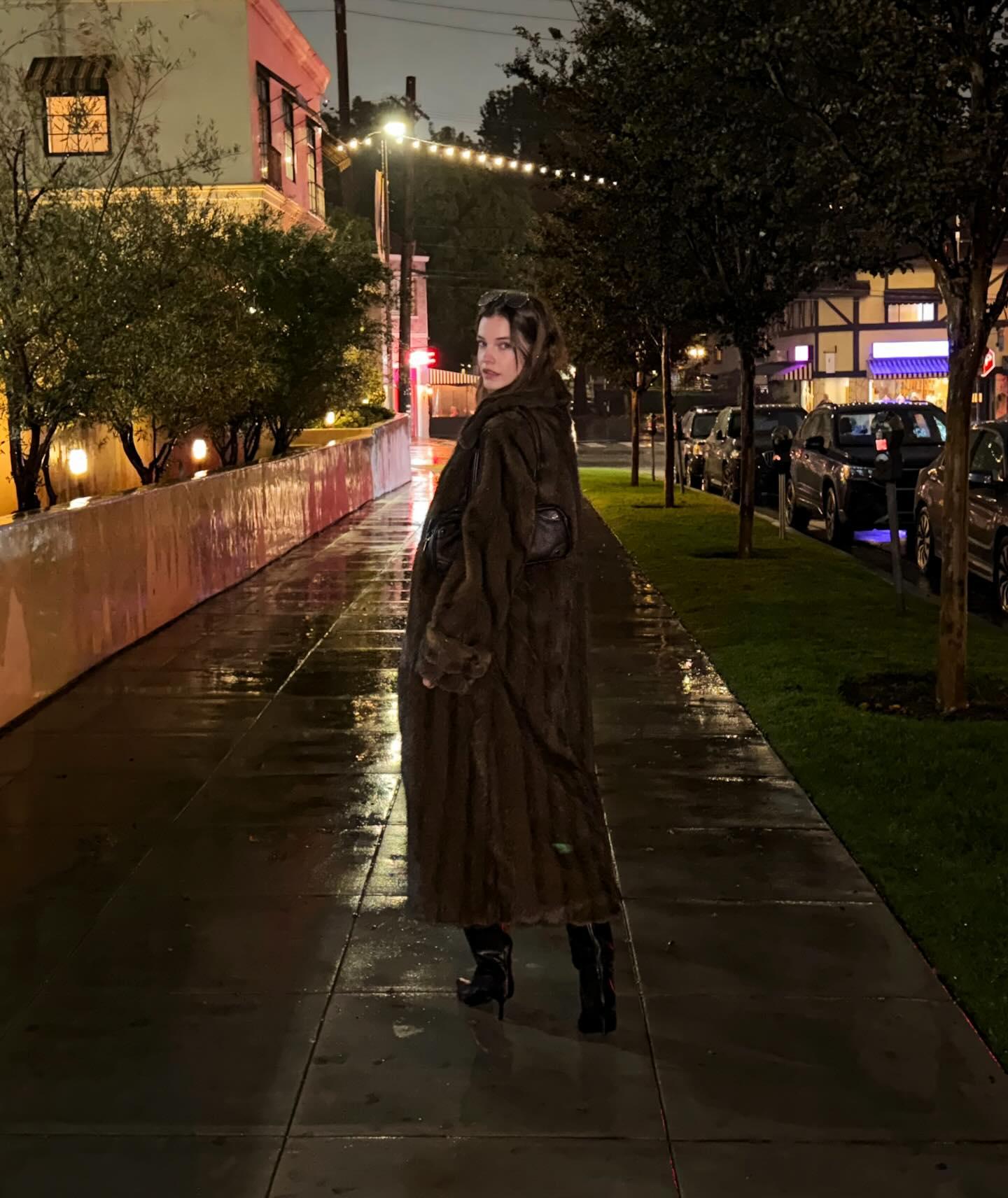 Чтобы образ оставался цельным, Барбара добавила теплую длинную шубку коричневого оттенка с отложным воротником. Она создает мягкую вертикаль и помогает сбалансировать высокие сапоги. Коричневый цвет сочетается и с бархатным платьем, и с черной кожей — оттенки дополняют друг друга, создавая спокойную, но выразительную палитру.
