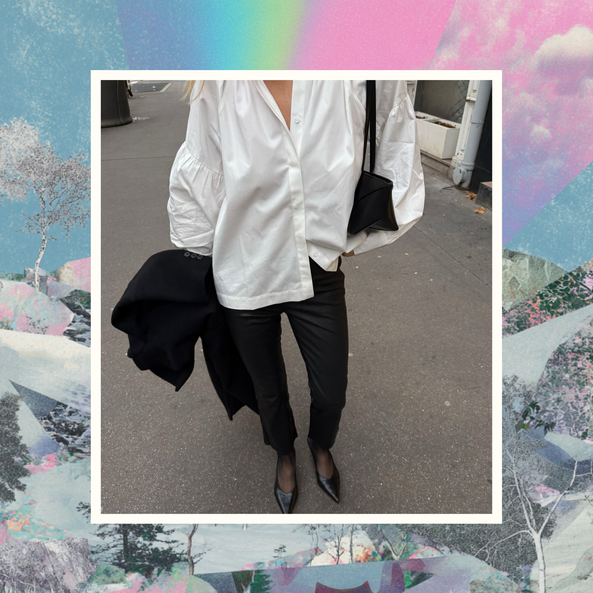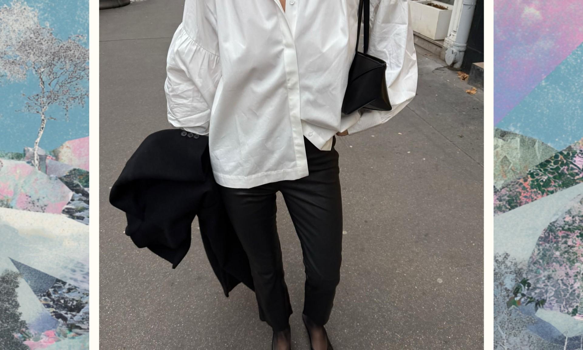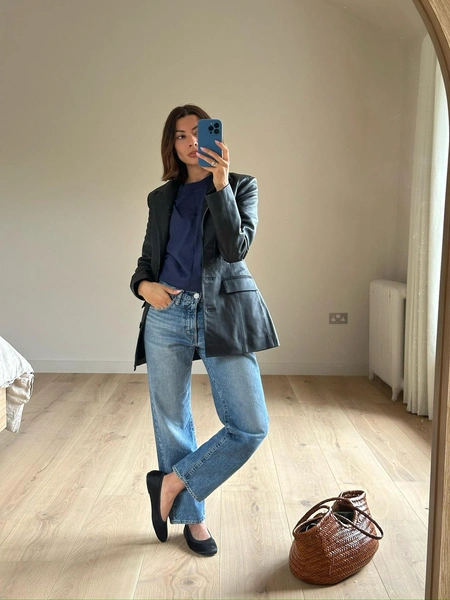 С верхом в этом образе можно не усложнять — подойдет почти все, но особенно удачно работают варианты, играющие на контрасте объемов. Например, кожаная куртка оверсайз добавит нужную долю дерзости и отлично сработает с укороченными джинсами. Укороченное пальто или бушлат мягко подчеркнет талию и не перекроет главный акцент — открытую щиколотку. Тренч свободного кроя задаст тот самый расслабленный парижский настрой, за который мы его и любим.