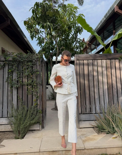 Если нужен вариант для самых теплых дней, выбирай льняные модели — они дышат и дают ощущение максимальной легкости. Для более строгих образов подойдут варианты из костюмной ткани: они добавляют элегантности и органично вписываются в офисный гардероб или образы для встреч.