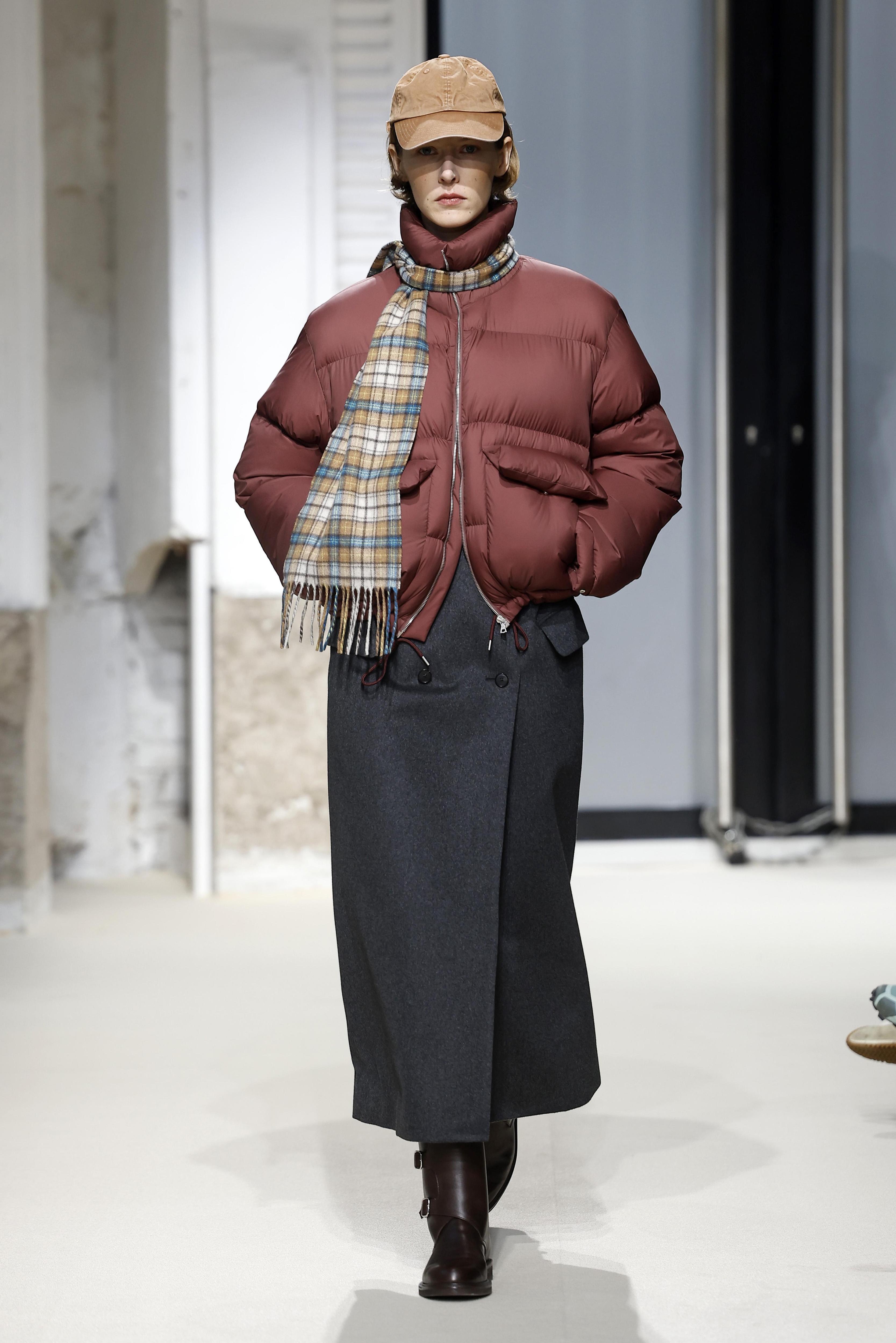 Теперь он чаще однотонный, спокойных оттенков и в идеале совпадает по цвету с самой курткой. Такой пуховик отлично смотрится с джинсами с низкой посадкой и сапогами на каблуке — немного ностальгии по нулевым, но в современном, расслабленном прочтении.