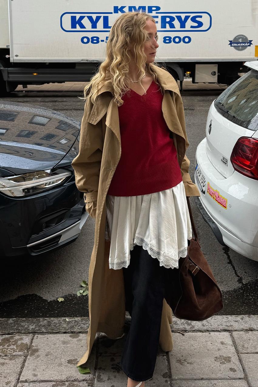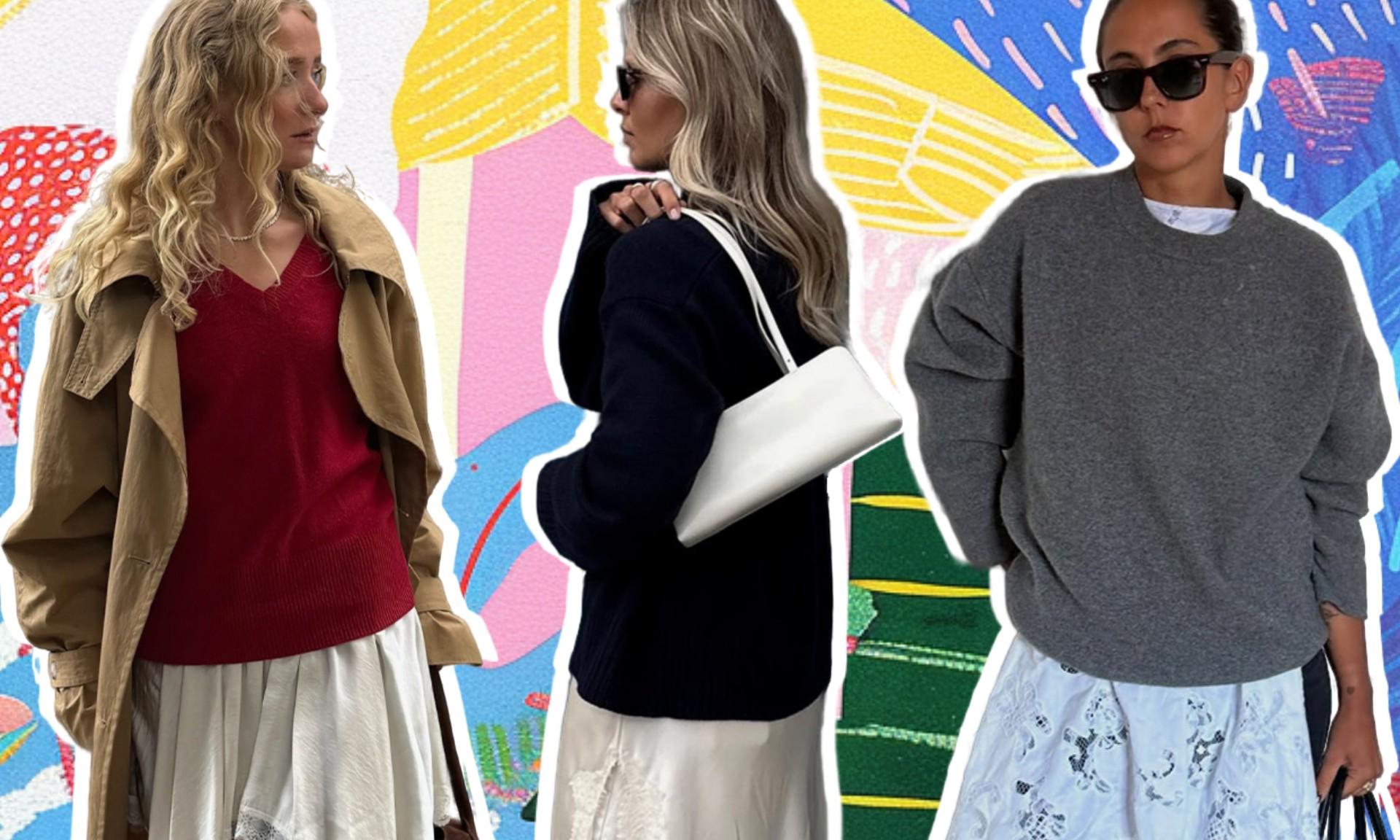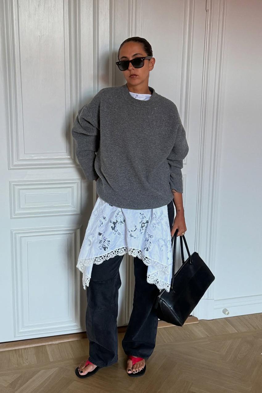 Главная причина успеха — игра с пропорциями. Когда ты надеваешь объемный свитер поверх чего-то деликатного и текучего, вроде шелкового платья, появляется нужное напряжение между женственностью и утилитарностью. Вдобавок это спасение для тех, кто не готов расставаться с летними вещами: просто добавь свитер — и легкое платье превращается в уютный зимний вариант.