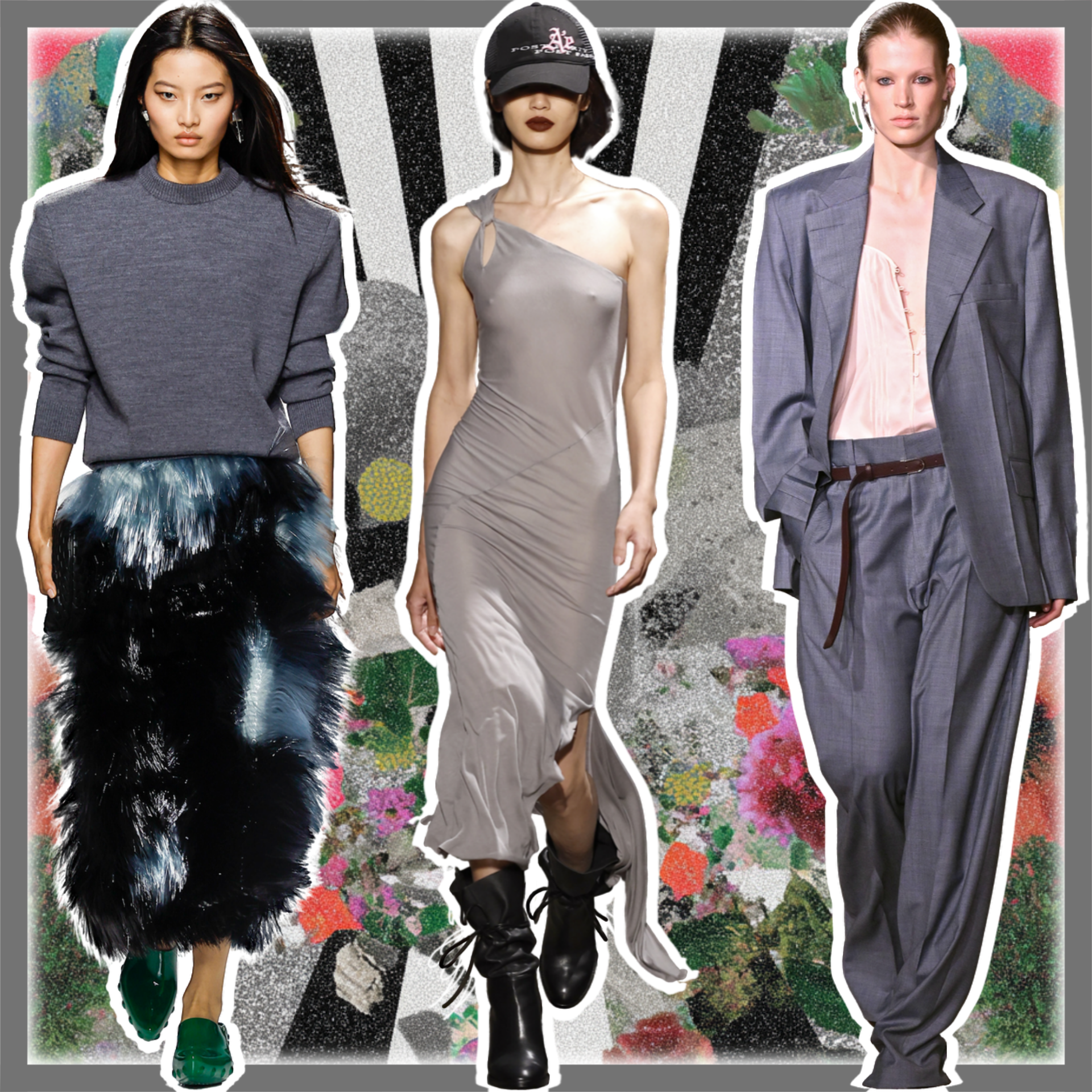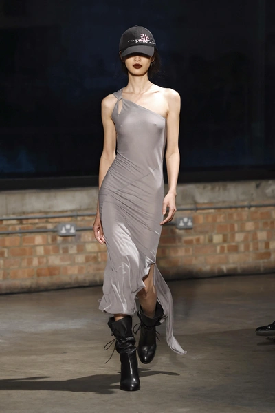 Серый оттенок сам по себе довольно аристократичен и сдержан, поэтому сочетание его вместе с характерными вещами (грубые и массивные ботинки, бомбер или оверсайз пальто мужского кроя) — интересная и необычная комбинация, которая подчеркнет динамичность аутфита и добавит легкой небрежности 🔥 Модный бренд Aaron Esh предлагает нам полностью кинуться в эклектику и, вдобавок ко всему, завершить образ бейсболкой! Хороший вариант, особенно если учитывать, что сейчас из всех головных уборов тренд пришелся именно на них.