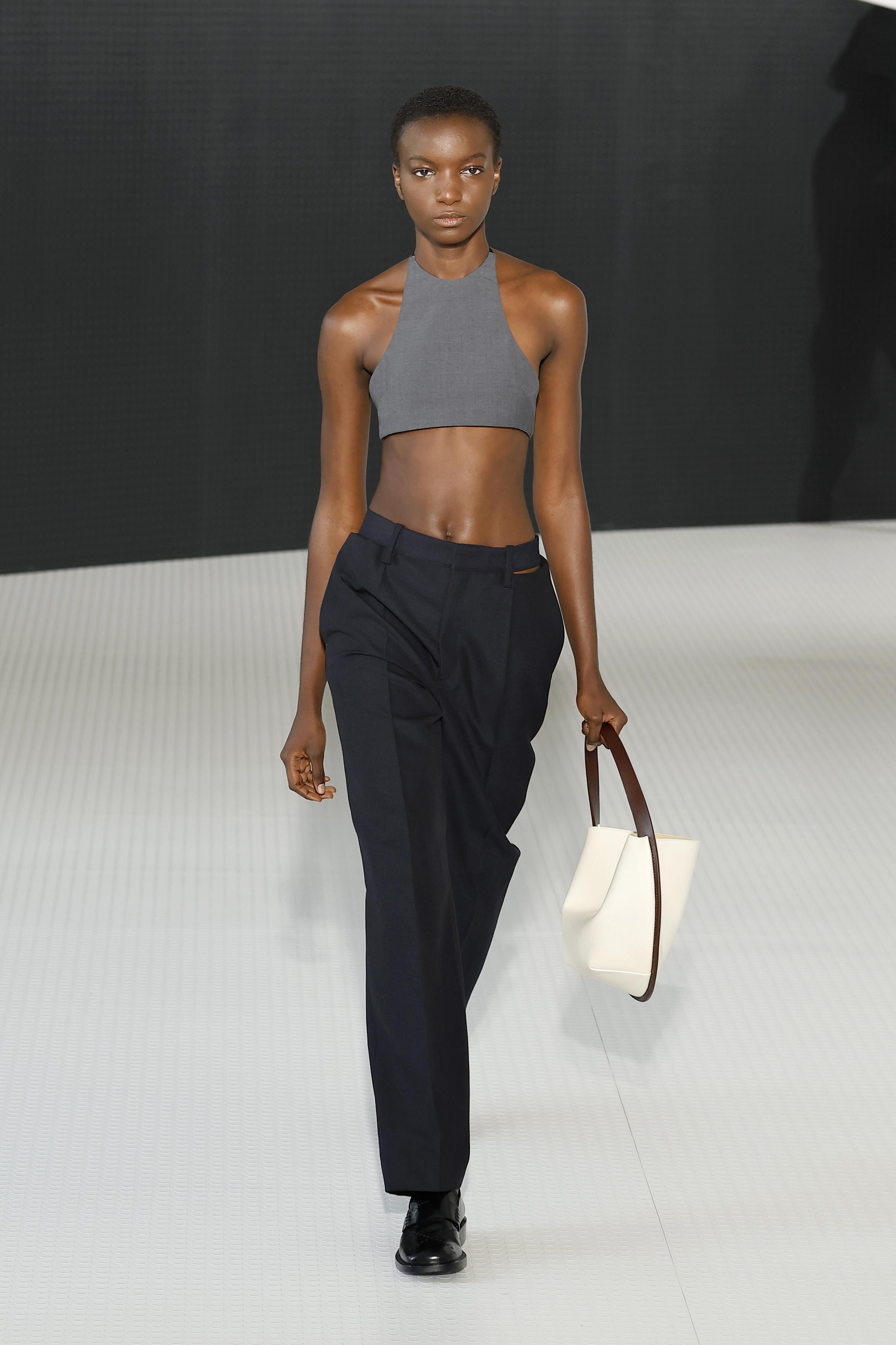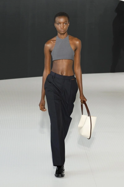 Бренд Victoria Beckham продемонстрировал на своем показе образ, в котором смешалась элегантность и женская изящность с легкой фамильярностью и где-то даже дерзкой уверенностью. Для достижения этого эффекта дизайнер использовал строгий костюм в правильном графитовом оттенке и, в противовес ему, летящую блузу в пыльно-розовом цвете 🩷 А завершил образ тонкий темно-коричневый ремешок.
