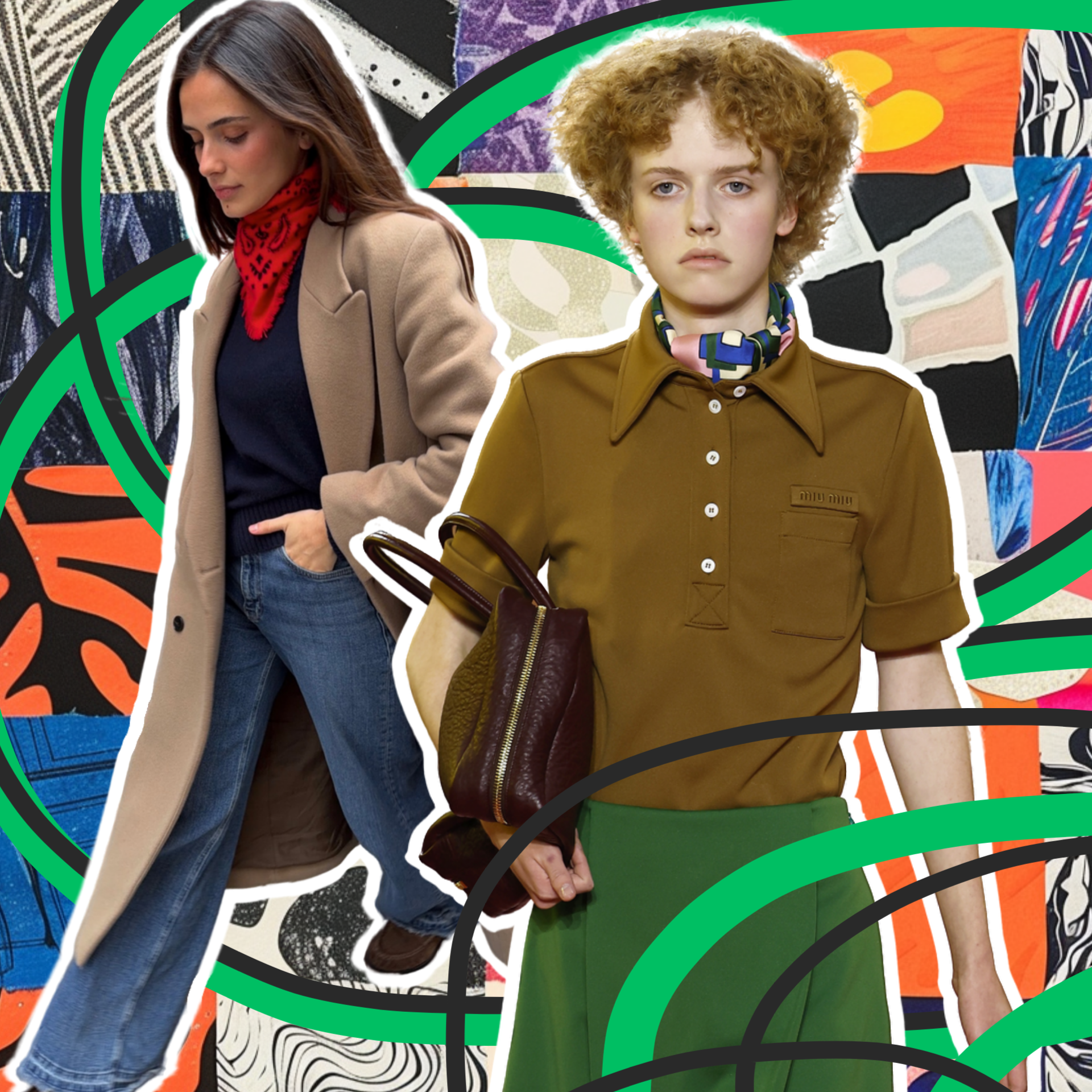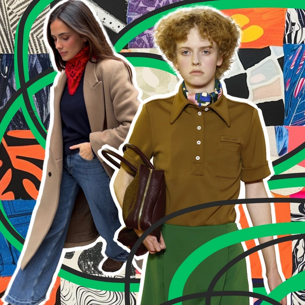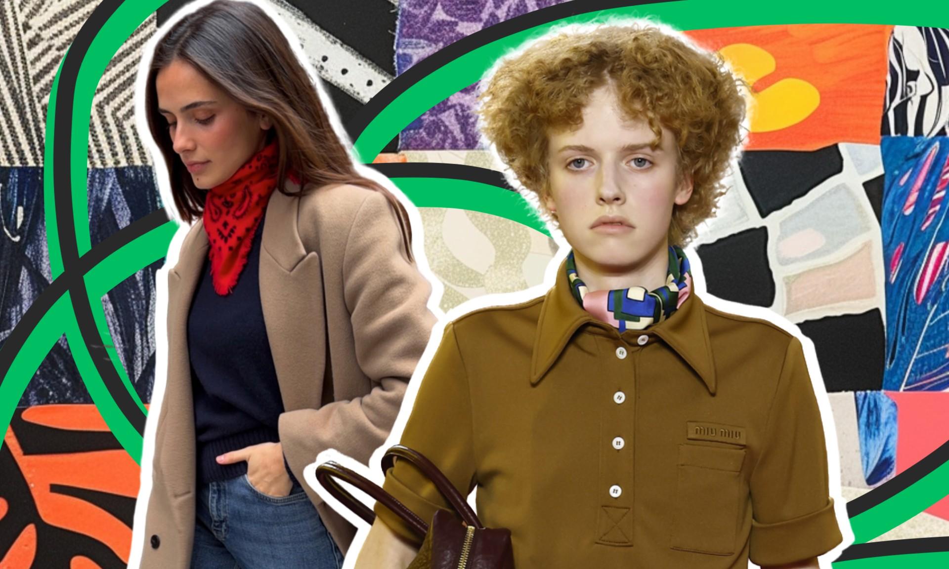Лучше всего работают небольшие квадратные платки из шелка или тонкой вискозы. Они легко завязываются и не создают лишнего объема. Принты — от классических геометрических до наивных и цветочных.