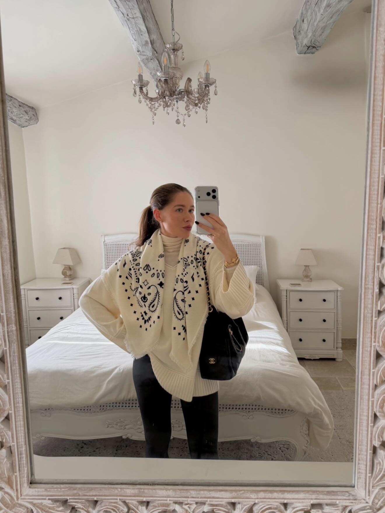 Важно и то, с чем его носили. Платки появлялись в сочетании с рубашками, трикотажем, лаконичными платьями, простыми жакетами — идеально для реальной жизни!