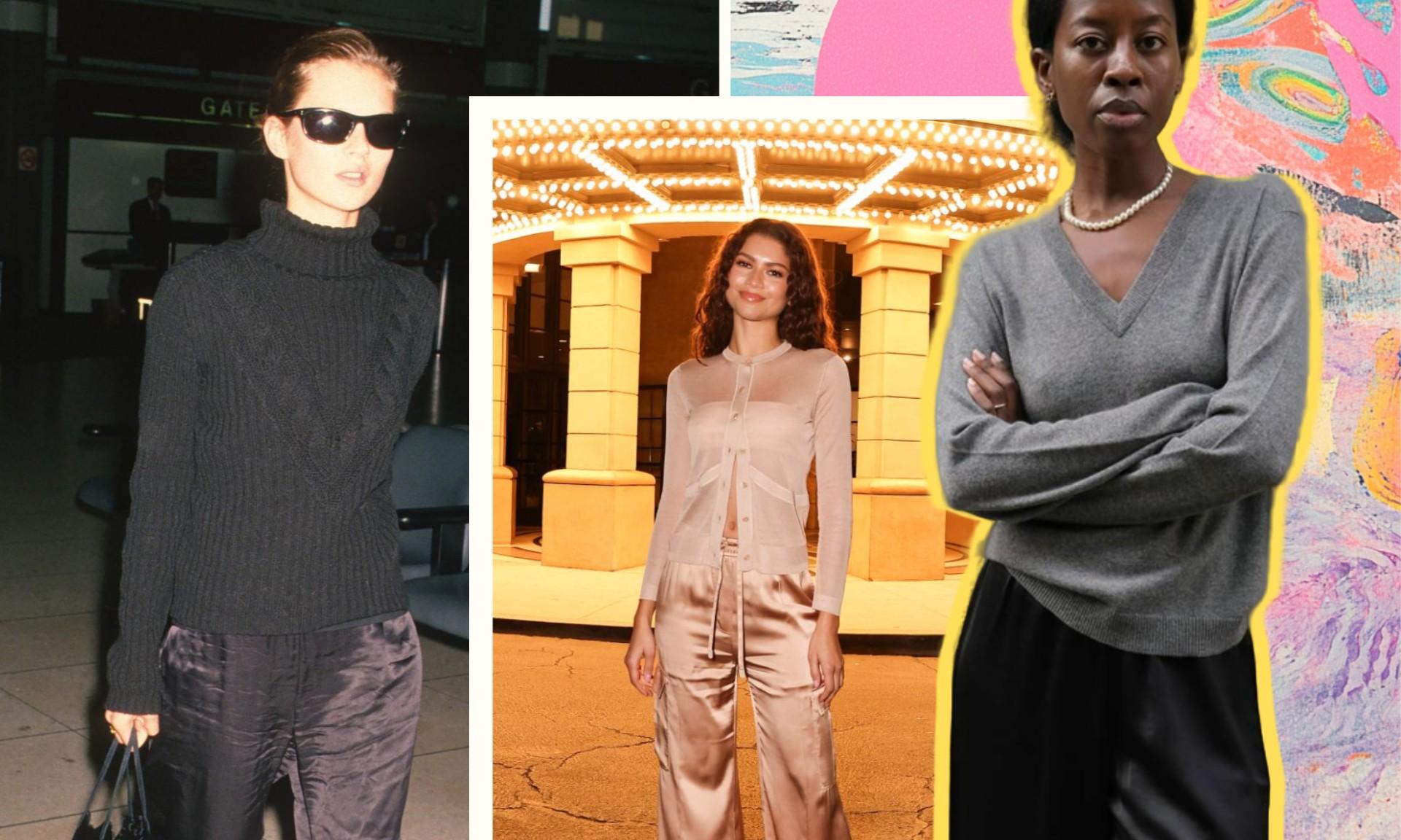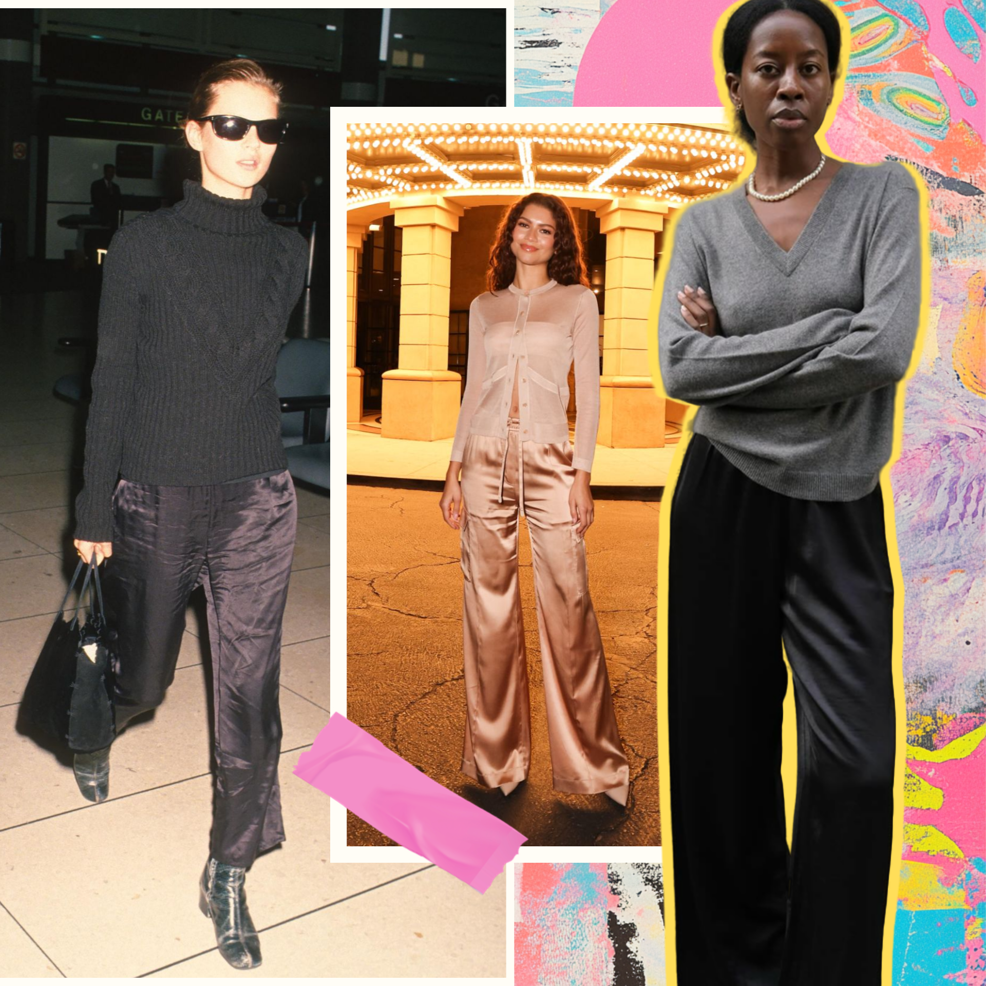 Иконы девяностых вроде Кейт Мосс уже давно показали нам, как носить эту вещь безупречно. Их формула проста: классические прямые темные атласные брюки, облегающий топ или водолазка, ботильоны и стильная сумочка. Подобные образы дышали той самой непринужденной элегантностью, которая и привлекает нас сегодня.