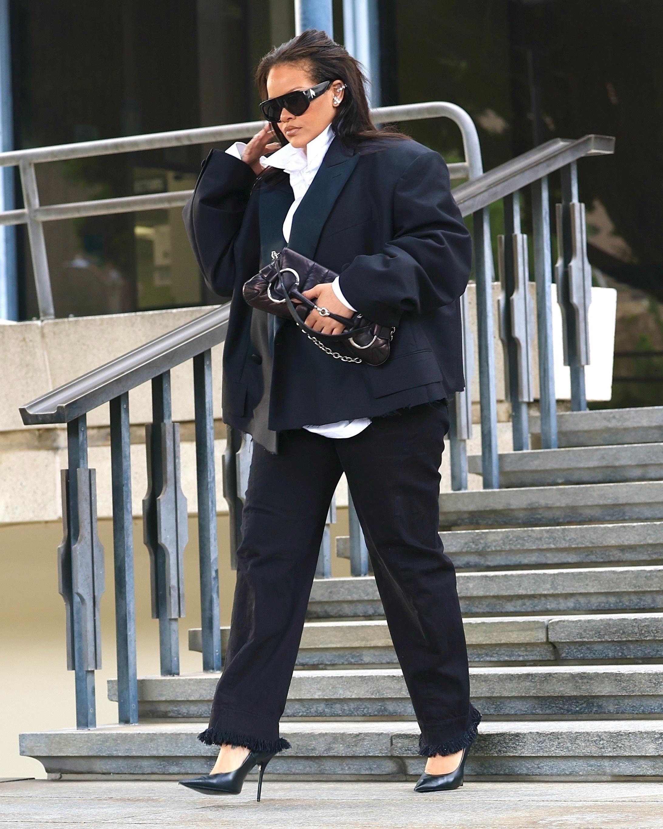С аксессуарами Рианна тоже не стала скромничать. В руках — лаконичный конверт-клатч Gucci, который работает как идеальный нейтральный акцент в черно-белой гамме. А солнцезащитные очки-маска от The Attico придали образу нужную долю дерзости — как будто она пришла не просто за документами, а на съемочную площадку 🔥