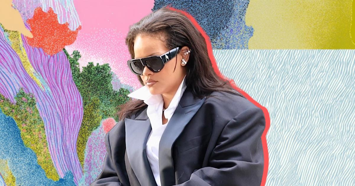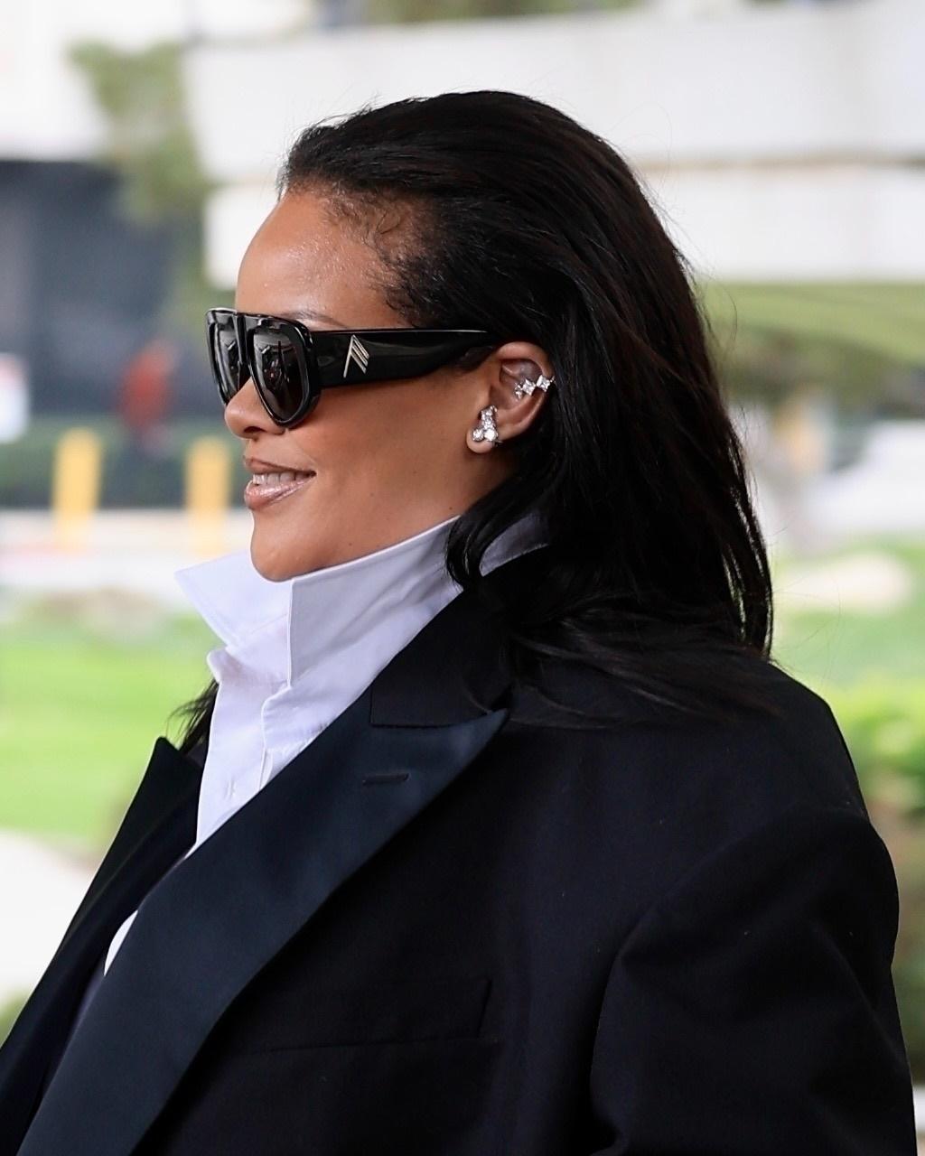 Для выхода она выбрала вариацию на тему смокинга. Рианна надела укороченный черный блейзер с необработанными краями. Этот элемент идеально сочетал в себе мужской крой и расслабленную дерзость. Под блейзером — белая рубашка с отложным воротником, слегка расстегнутая сверху, чтобы образ не уходил в слишком официальную сторону. Кажется, только она умеет носить офисный стиль так, что он становится настоящим модным заявлением.