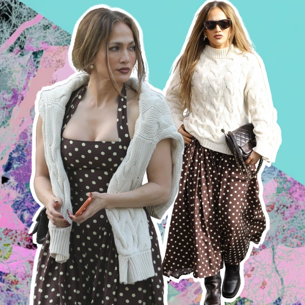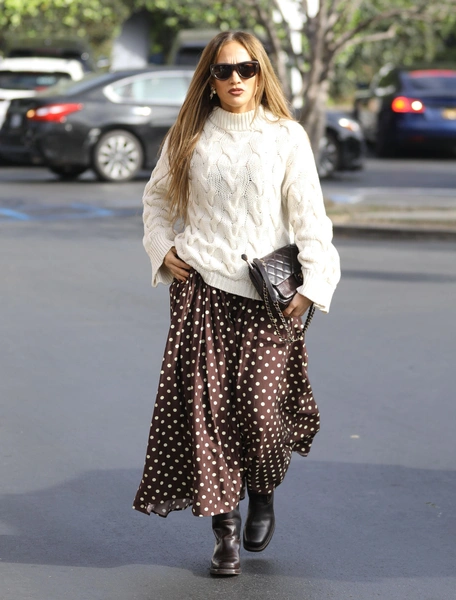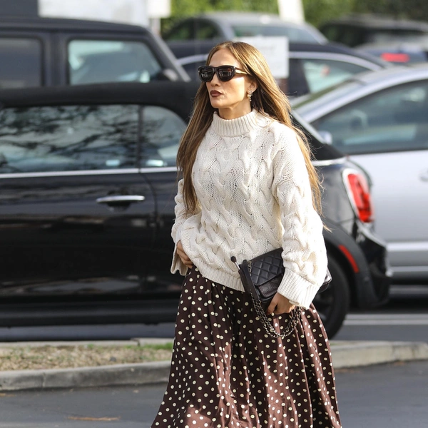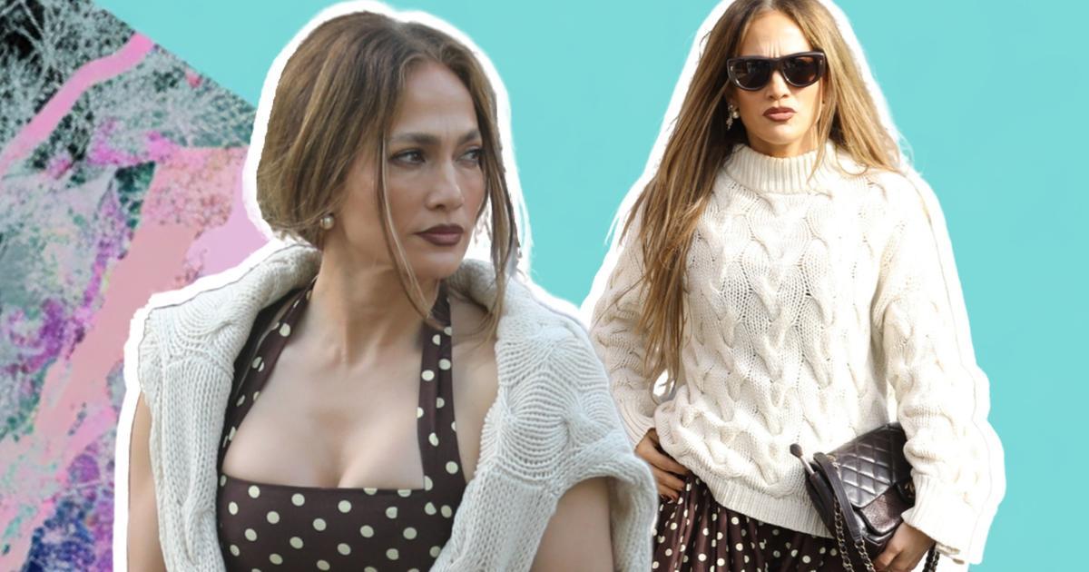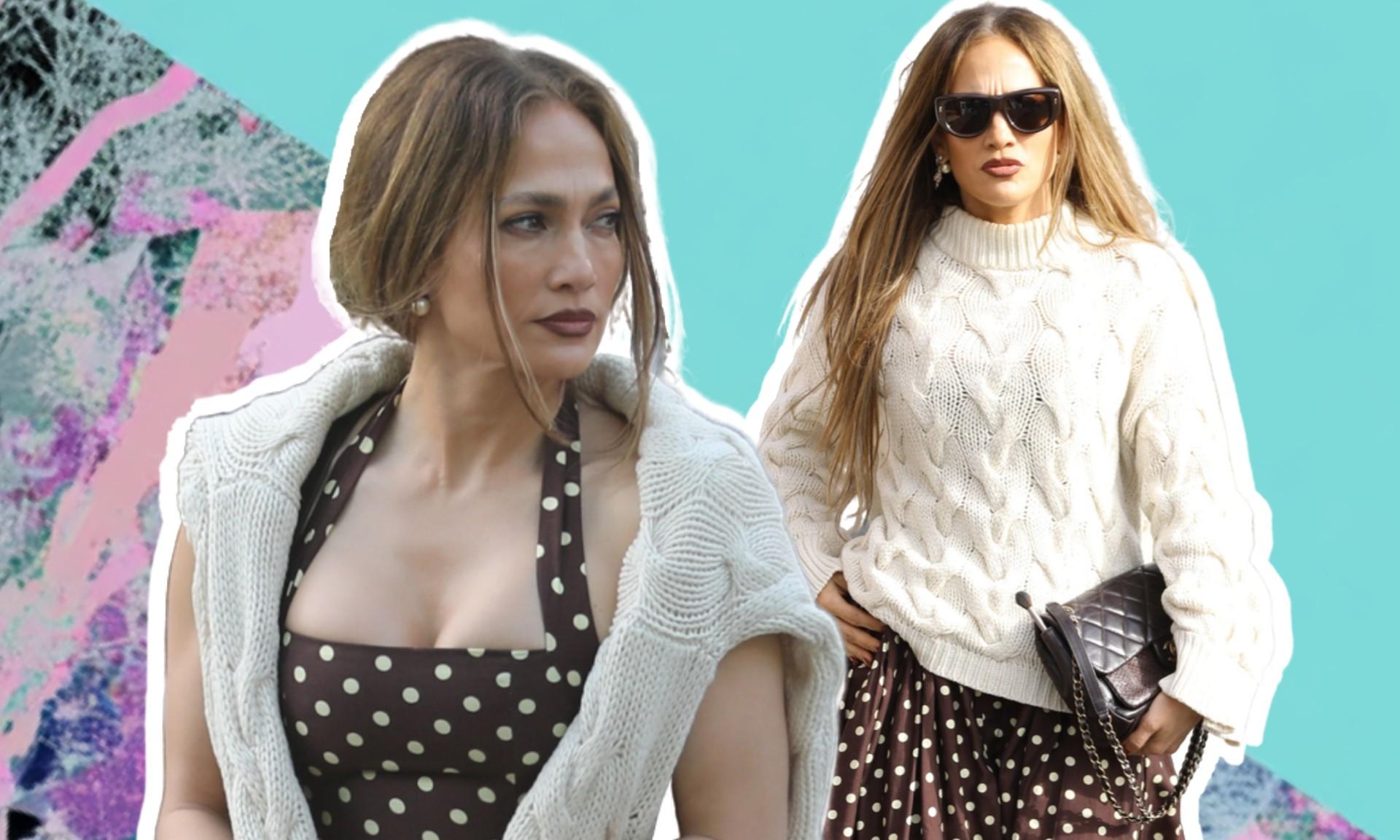 Важно и то, что Лопес выбрала понятную формулу, которую легко адаптировать под любой гардероб. Платье может быть однотонным или с принтом, длинным или чуть короче. Свитер — обязательно мягкий, объемный и нейтрального оттенка. Слишком тонкие модели лучше оставить для других случаев: они теряются на фоне платья и почти не греют.