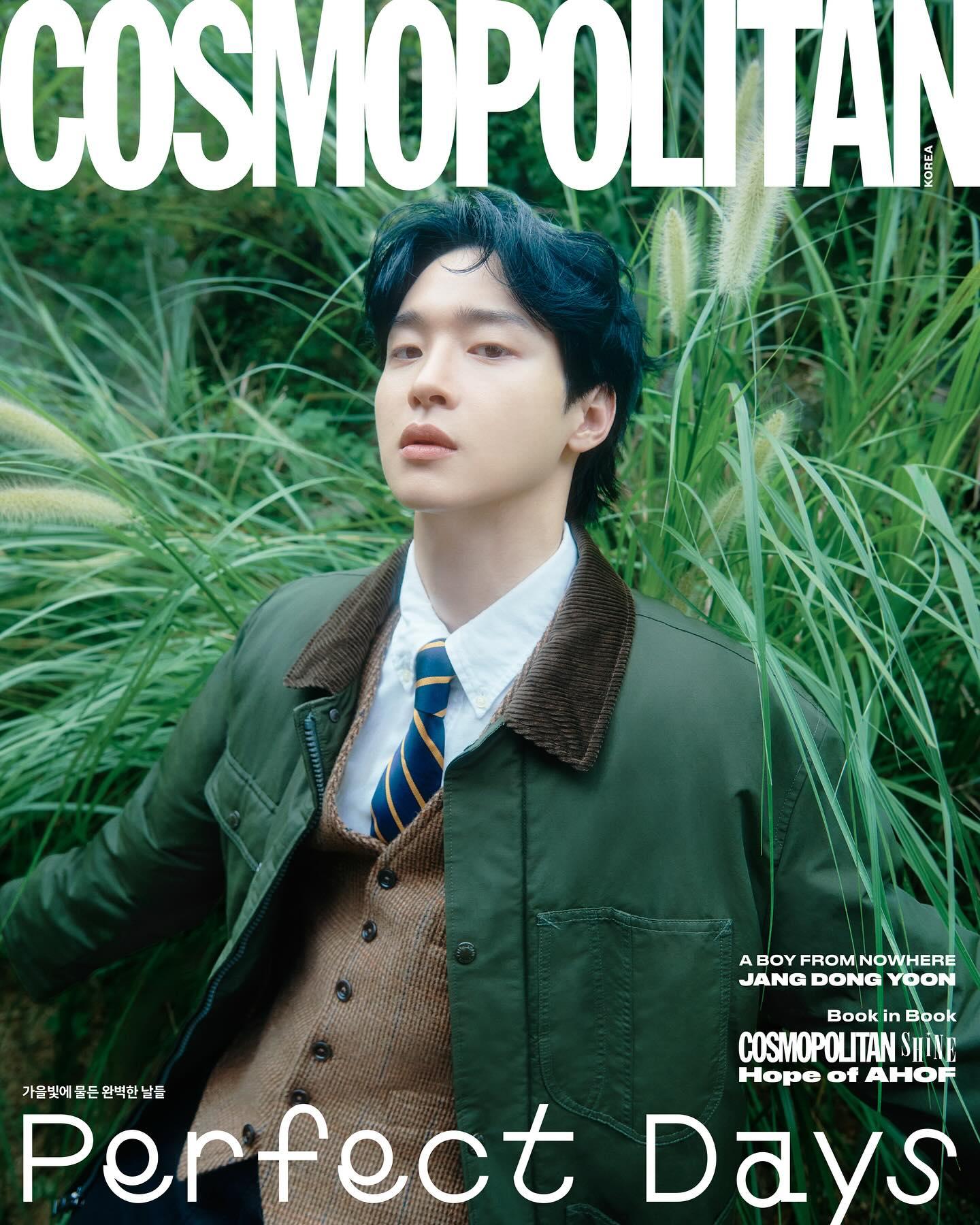 Cosmopolitan, как всегда, пошел по пути свежести и живости. Дон Юн, покоривший сердца зрителей сериалами «Школа 2017» и «Сказка о Нокду», выглядит как настоящий романтический герой из литературного произведения: в объемной «рабочей» куртке с белой рубашкой с галстуком и жилетом под ней, среди пышной зеленой травы, которая сливается с его одеждой, с задумчивым лицом, слегка взъерошенными волосами и фарфоровой кожей.