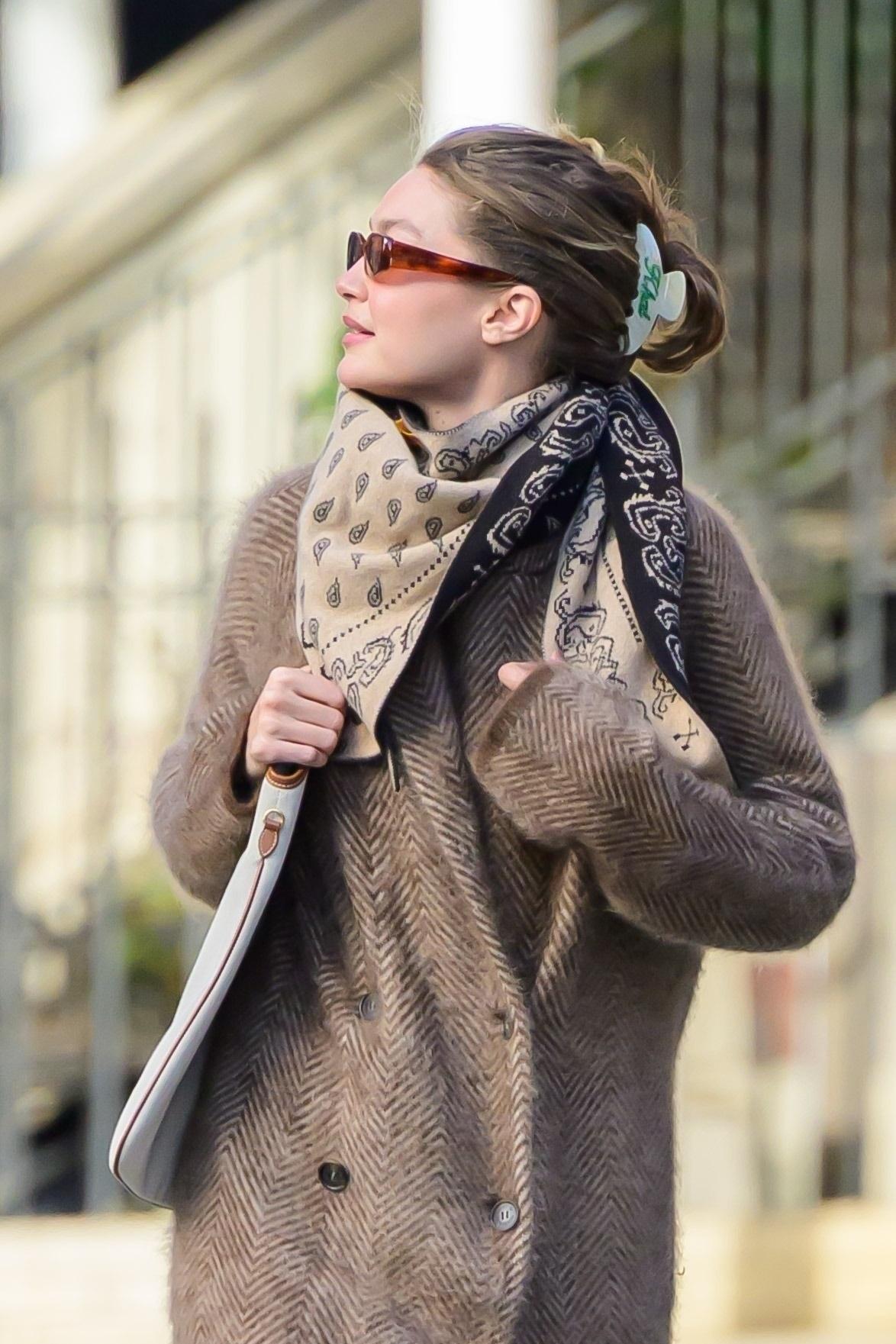 Образ был почти полностью собран из вещей ее собственного бренда Guest in Residence. Джиджи давно поддерживает идею качественного трикотажа, и именно такой трикотаж стал основой ее повседневного стиля. Пальто с начесом, выполненное в оттенках каштана и серо-коричневой гаммы, украшал узор «елочка».