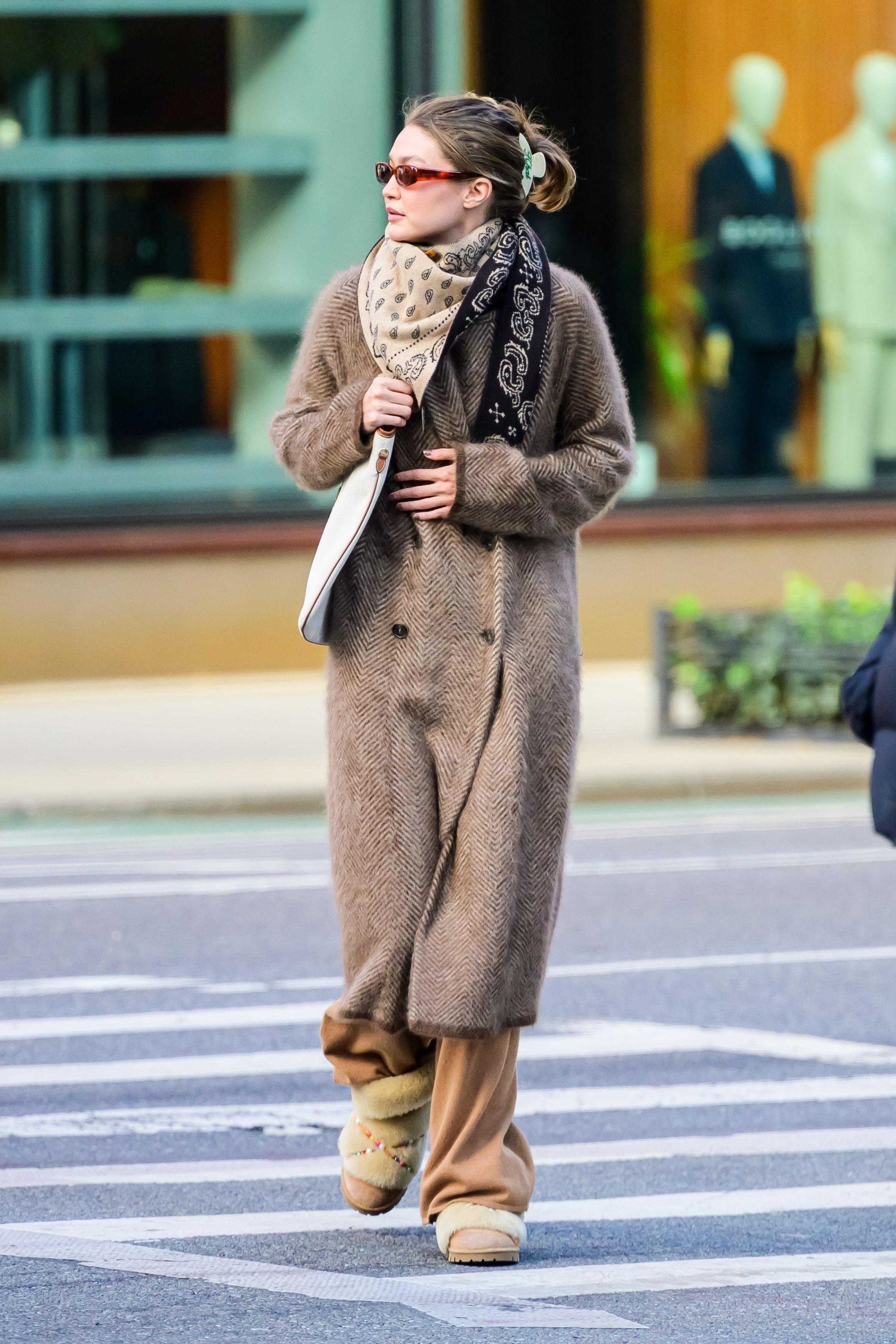Накануне модель появилась на улицах Манхэттена в наряде, который трудно назвать иначе как примером городского уюта. Длинное двубортное пальто она накинула поверх свободных трикотажных брюк цвета верблюжьей шерсти. Брюки она небрежно заправила в высокие угги, почти полностью покрытые овечьим мехом.