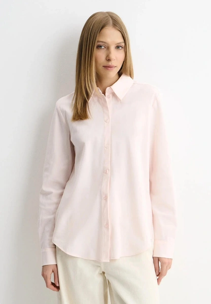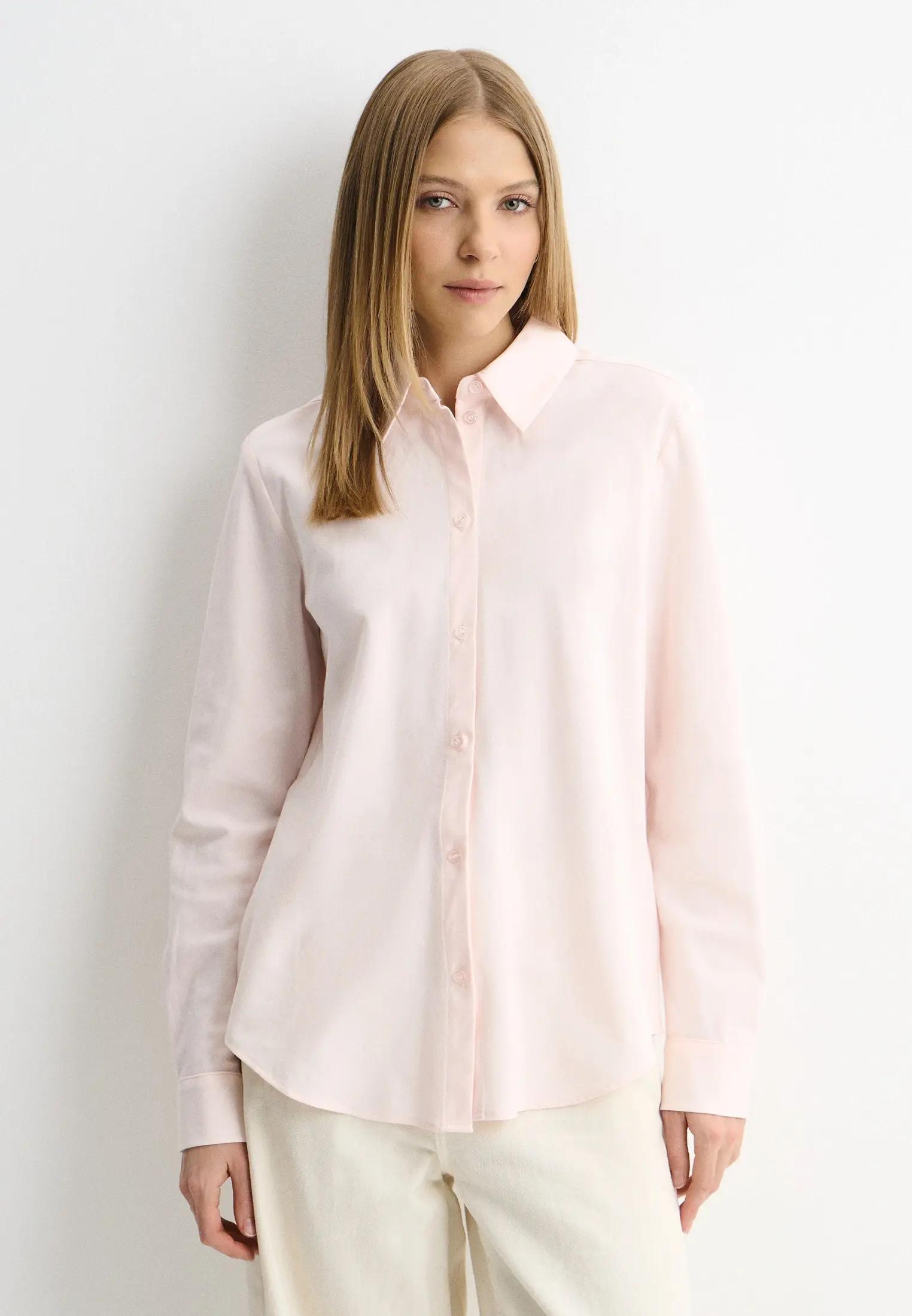 Небесно-голубая или, возможно, нежно-розовая — ее можно надевать и с пиджаком, и соло вместе с любым низом из года в год. Она освежает лицо, добавляет образу воздушности и работает как идеальный нейтральный фон для любых экспериментов.