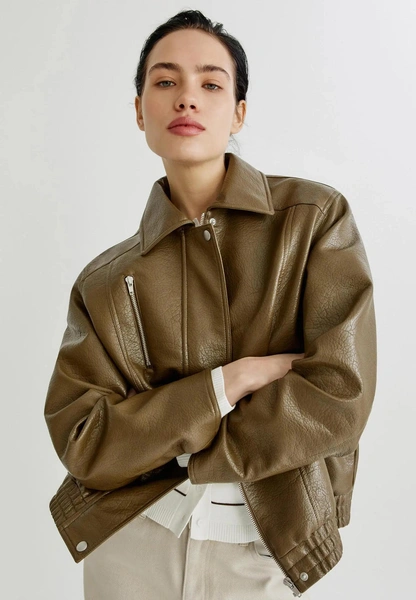 Нет, не типичная косуха с декором, ремешками и молниями по всей поверхности. Аккуратная кожанка, больше похожая на кожаный жакет, — вот что нужно искать. Лаконичная, без излишних деталей, с чистыми линиями. Такую куртку ты будешь носить много лет и не надоешь самой себе. Она одинаково хороша и с платьем, и с джинсами, и даже с офисными брюками.