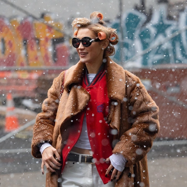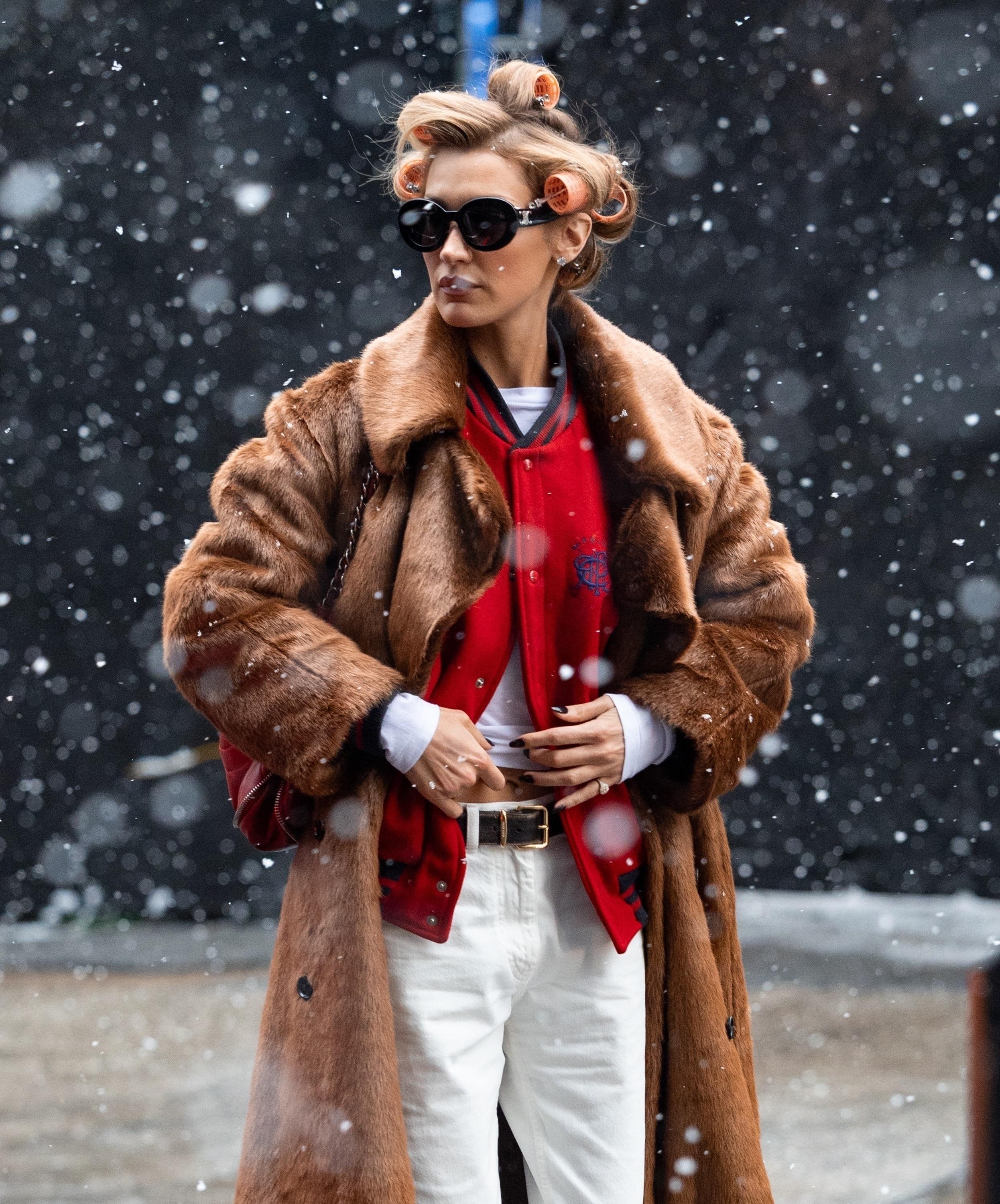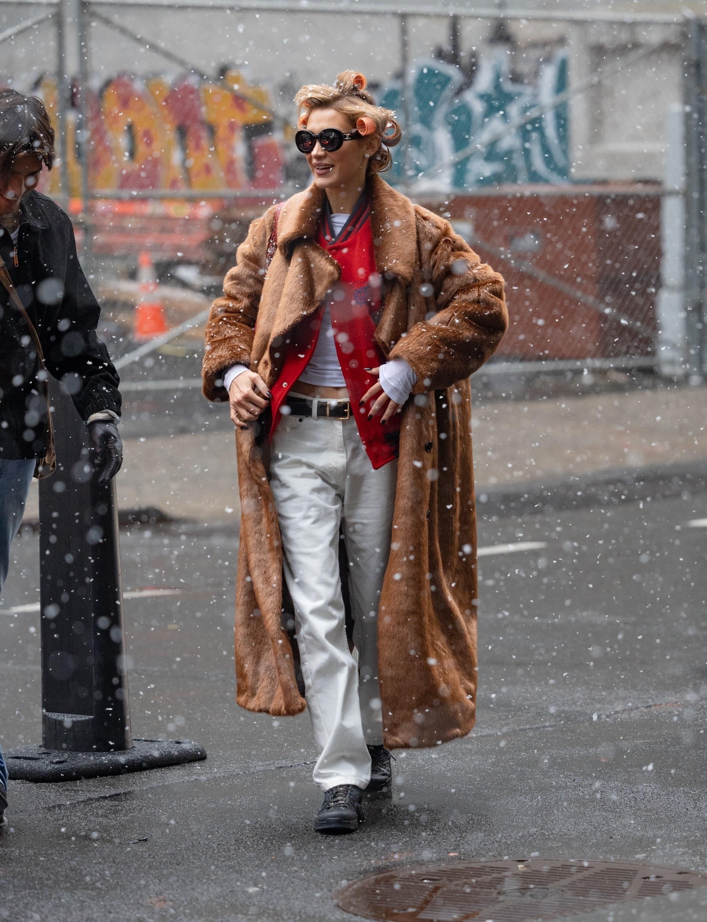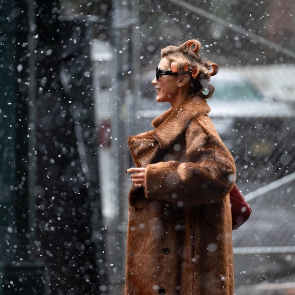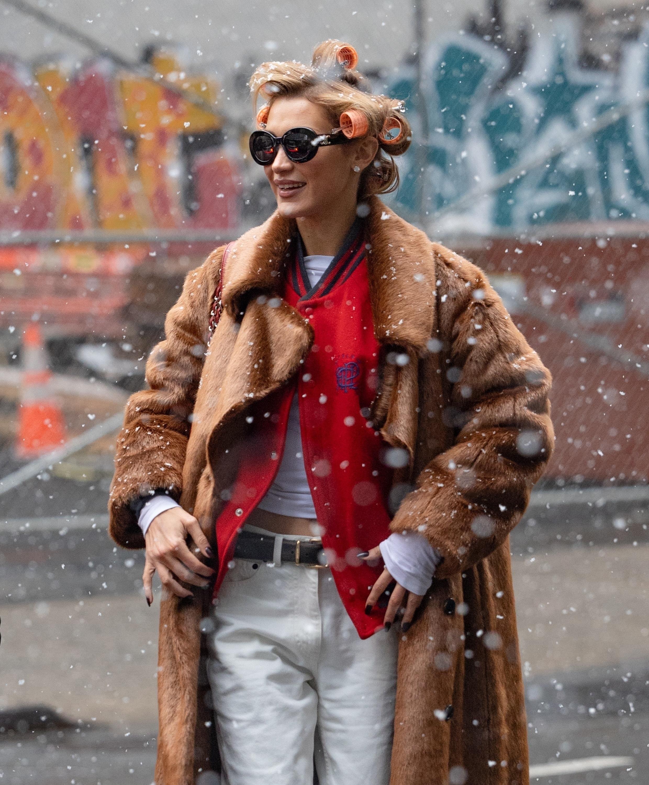 Снег оседал на ее лице, а Белла иронично прикрывала глаза черными овальными солнцезащитными очками. Но больше всего внимания привлекла деталь, которую сложно не заметить: розовые роликовые бигуди, удерживающие ее медово-каштановые волосы. Именно они придали образу особую трогательность.