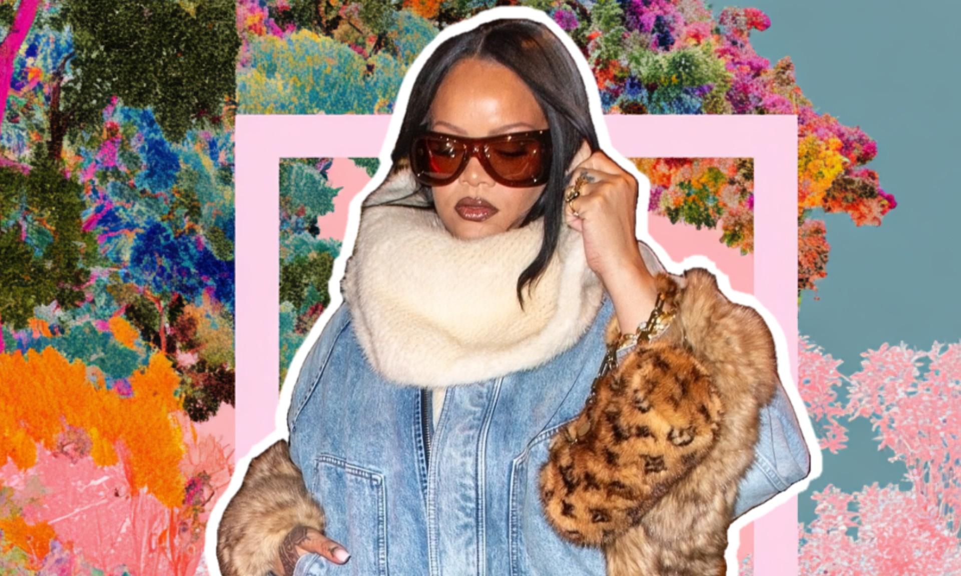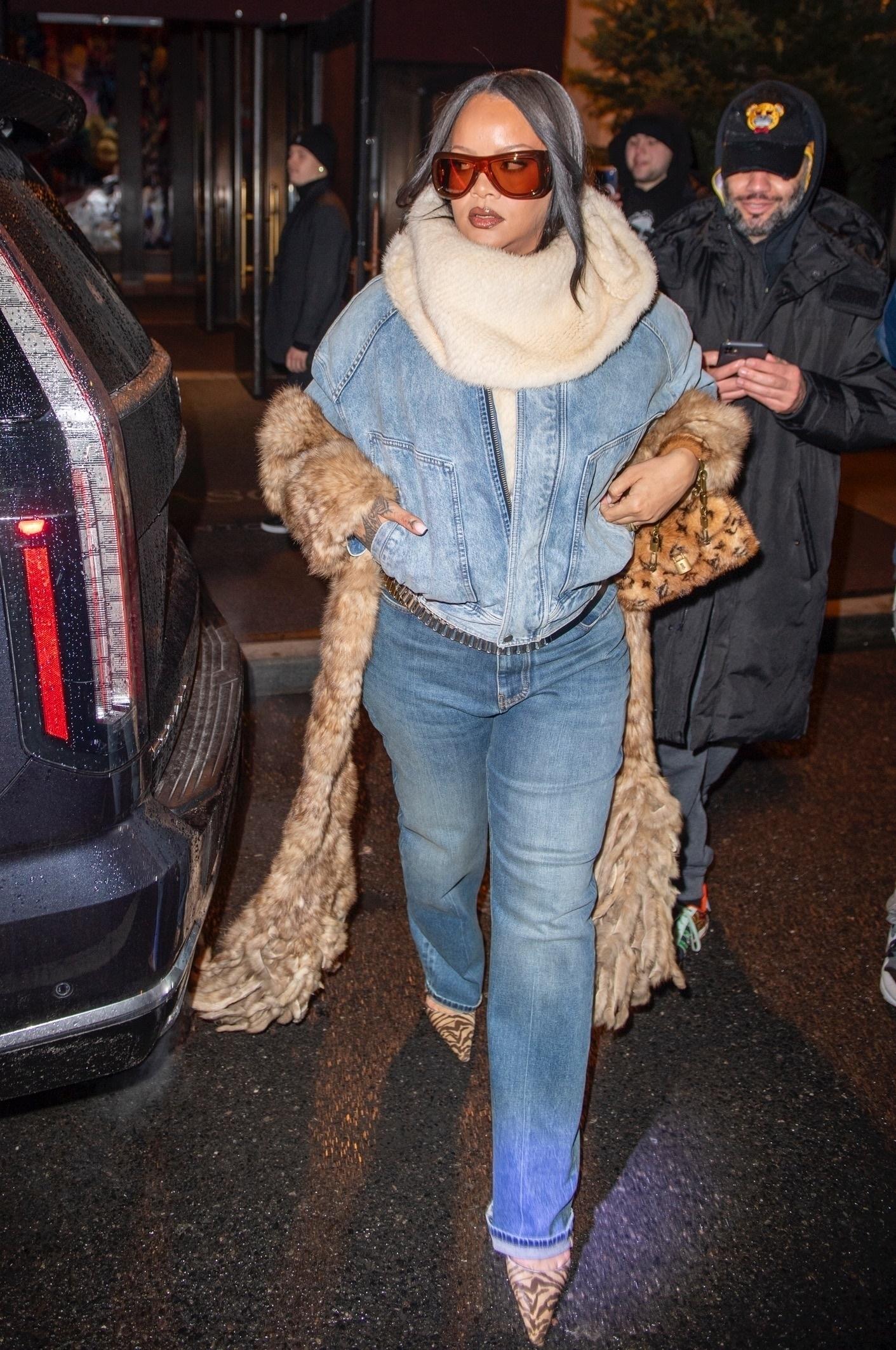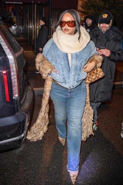 Но ключевой поворот случился на уровне деталей. Рианна добавила в образ мех — причем очень много меха 😁 И именно он полностью изменил настроение комплекта. Объемная винтажная меховая шаль из коллекции Jean Paul Gaultier осень-зима 1999 небрежно обрамляла плечи, лежала поверх денима так гармонично, будто так и было задумано изначально. К ней певица добавила кремовый меховой шарф-снуд и еще пушистую мини-сумочку цилиндрической формы Louis Vuitton из лимитированной серии. Этот клатч с монограммой когда-то был представлен на показе осень-зима 2004, еще в эпоху Марка Джейкобса.