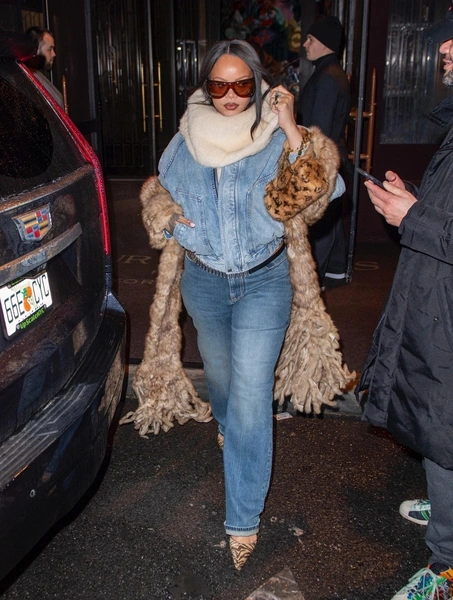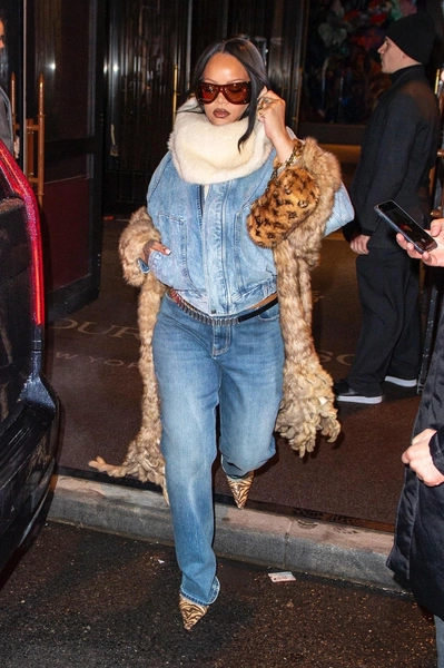 Вечер начался в Гарлеме, у ресторана El Puerto, где оба появились в дениме с ног до головы. Если Рокки выбрал более прямолинейную версию джинсового костюма, то Рианна пошла сложным и куда более выразительным путем. На ней была светло-голубая джинсовая куртка Saint Laurent, аккуратно скроенная и подчеркивающая линию плеч, и мешковатые длинные джинсы более темного оттенка. Контраст оттенков делал образ собранным и визуально привлекательным — важный прием, если речь идет о тотал-дениме.