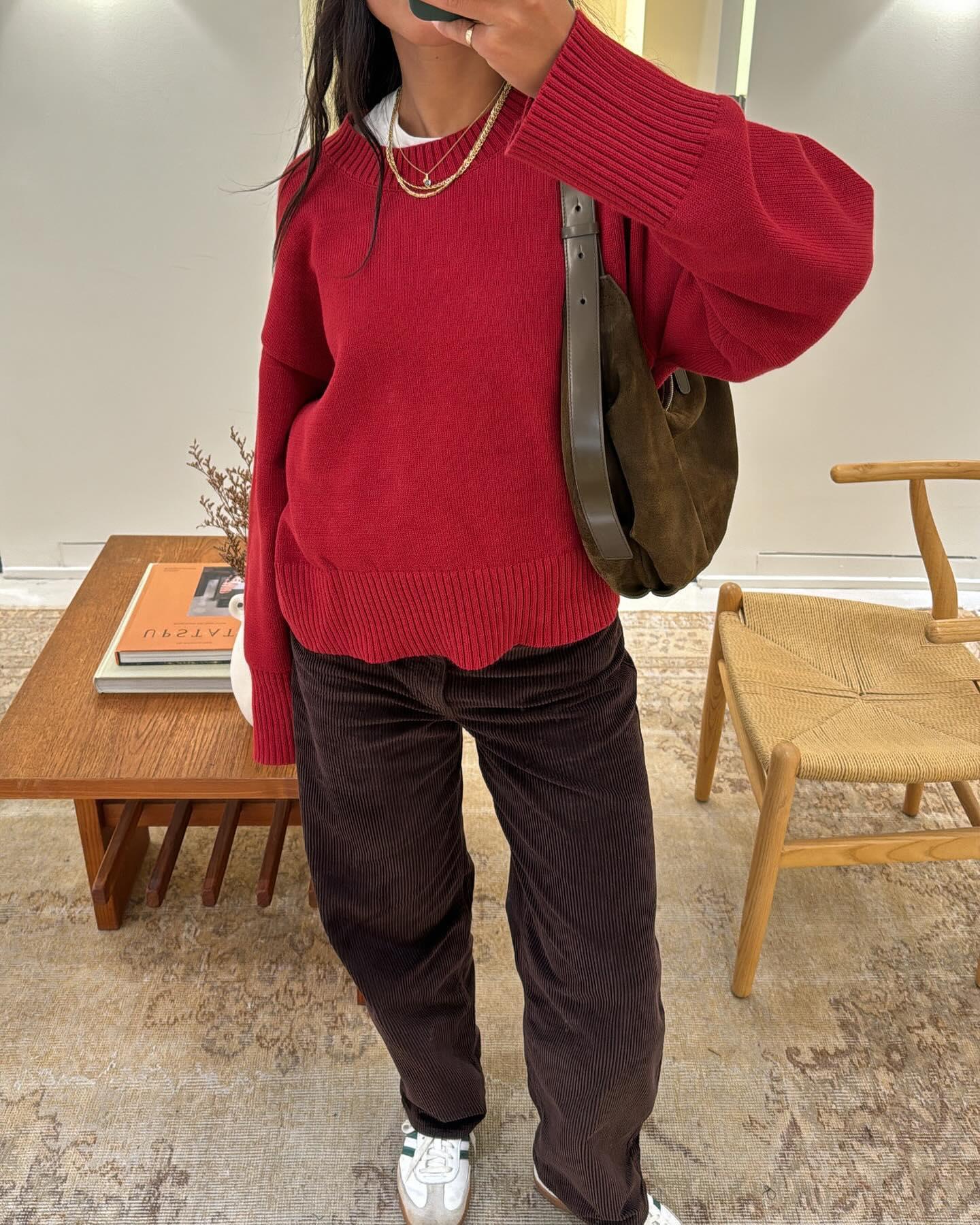 Хочешь добавить цвета, но без лишнего риска? Попробуй сочетание темного шоколадного и яркого красного. Это теплая, уверенная пара оттенков, которая не кричит, а звучит сдержанно и благородно. Красный джемпер оживит вельветовую текстуру, а если добавить еще коричневые аксессуары, получится идеально сбалансированный зимний образ.