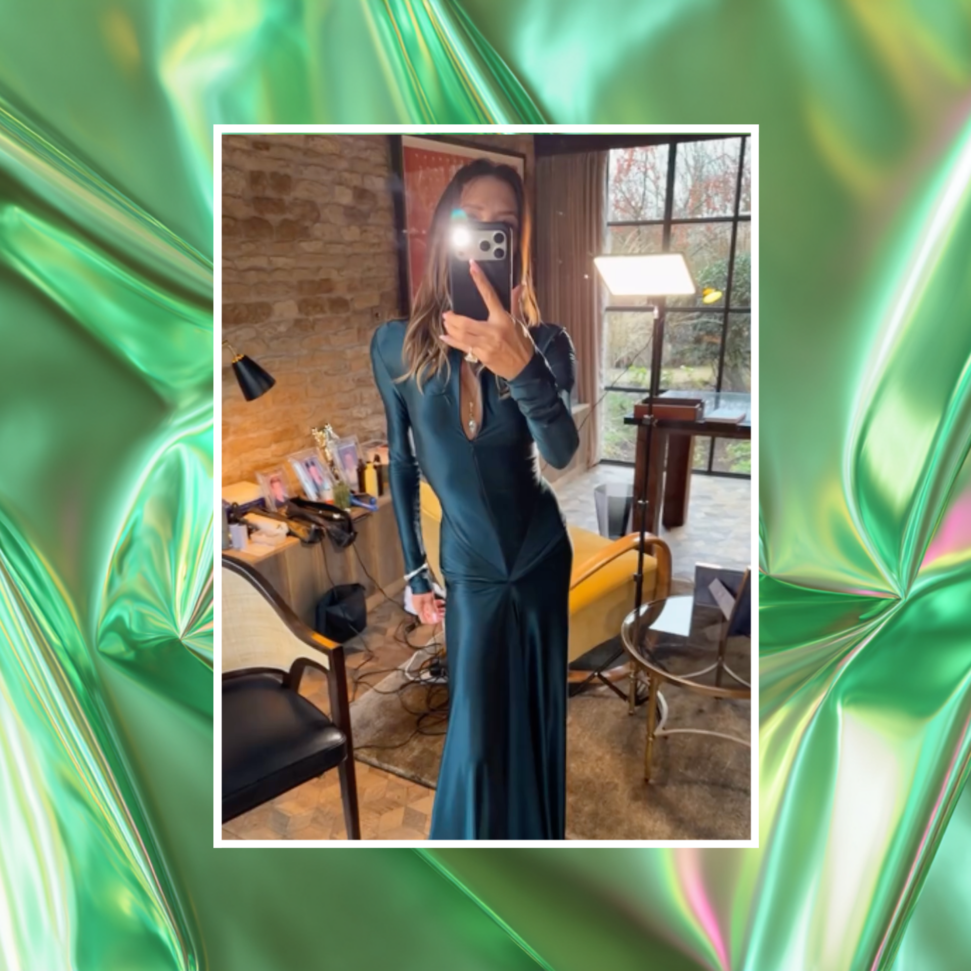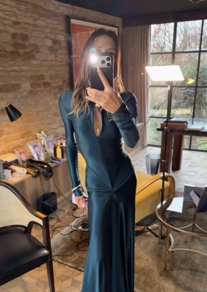 Виктория Бекхэм поделилась в своих соцсетях коротким видео, в котором показала, как готовится к вечернему мероприятию. В кадре Виктория уверенно и спокойно красуется в наряде и с явным удовольствием демонстрирует платье из собственной коллекции, сопровождая ролик простой, но очень личной подписью: «Обожаю, обожаю, как сидит это платье из бирюзового тянущегося джерси. Идеальный вечерний силуэт для особого случая».