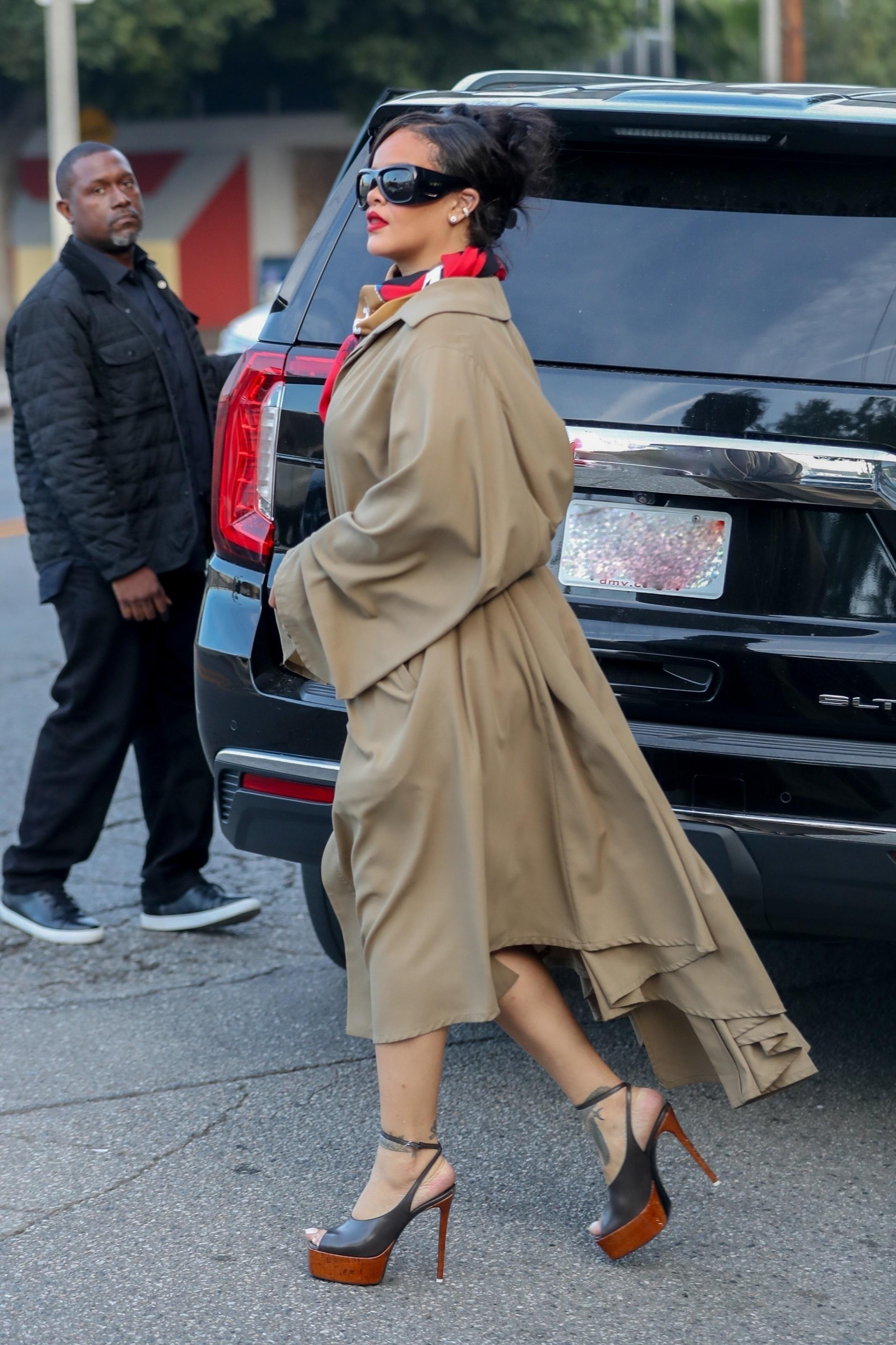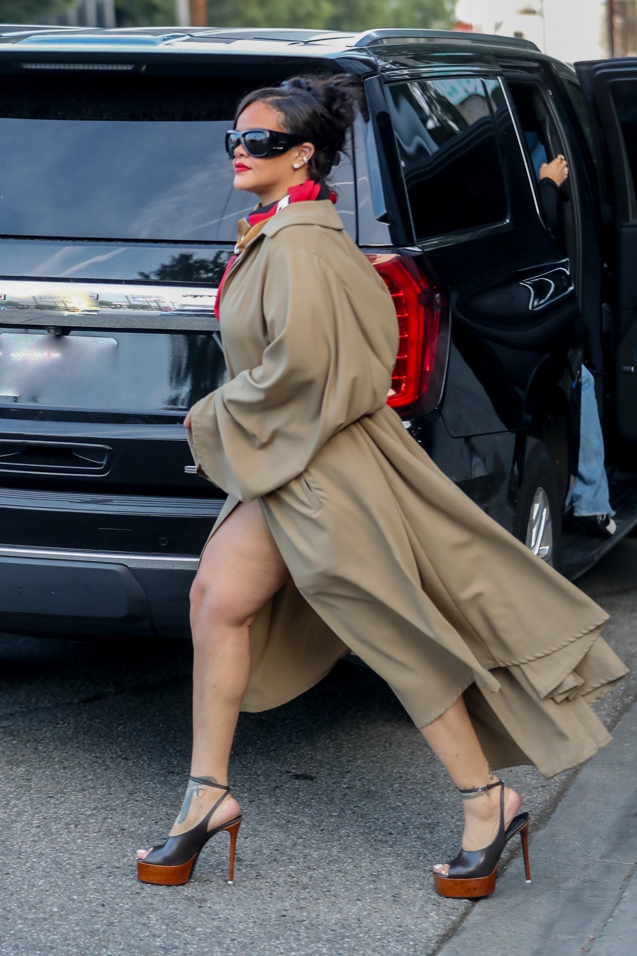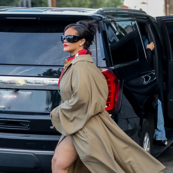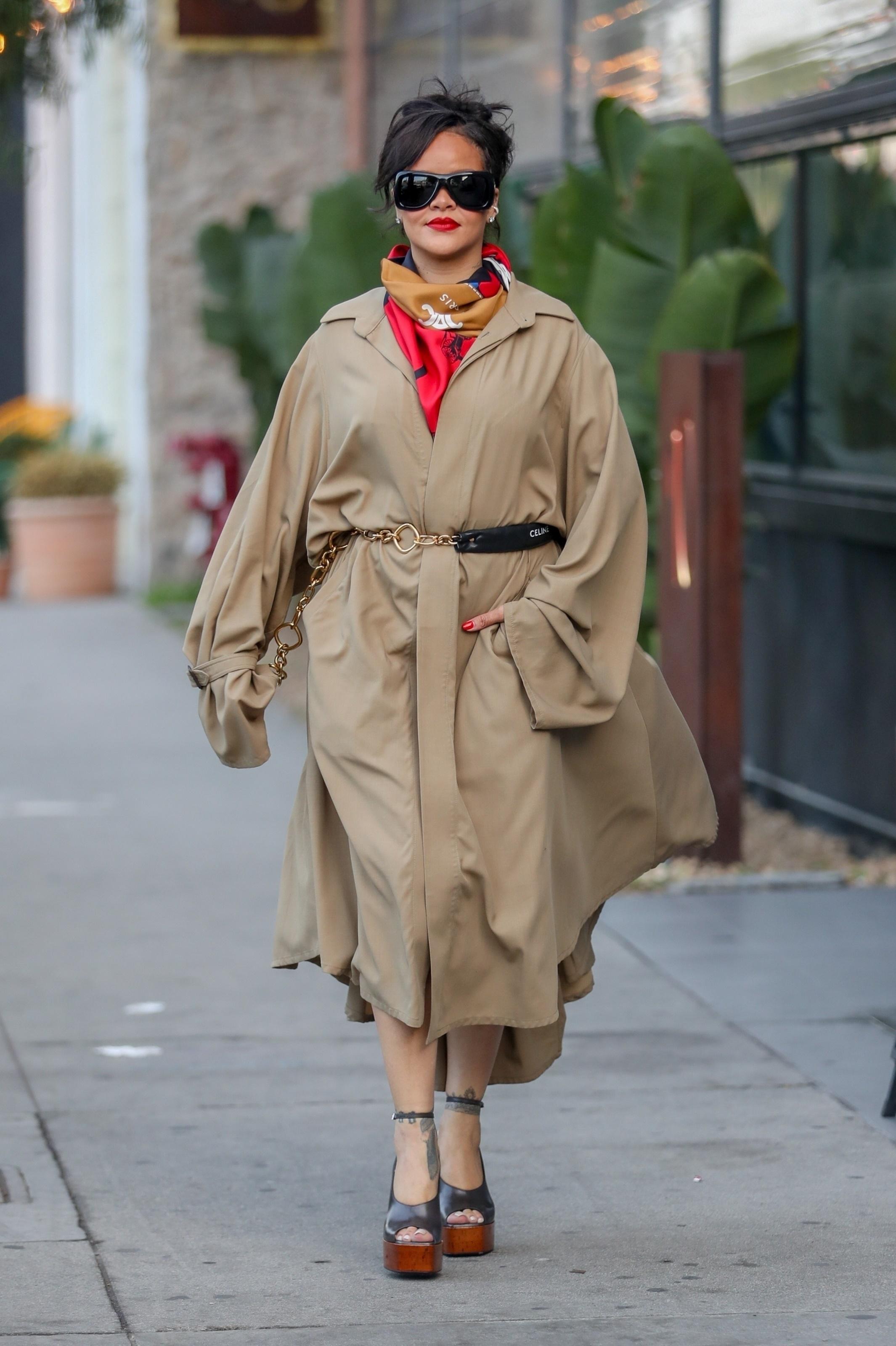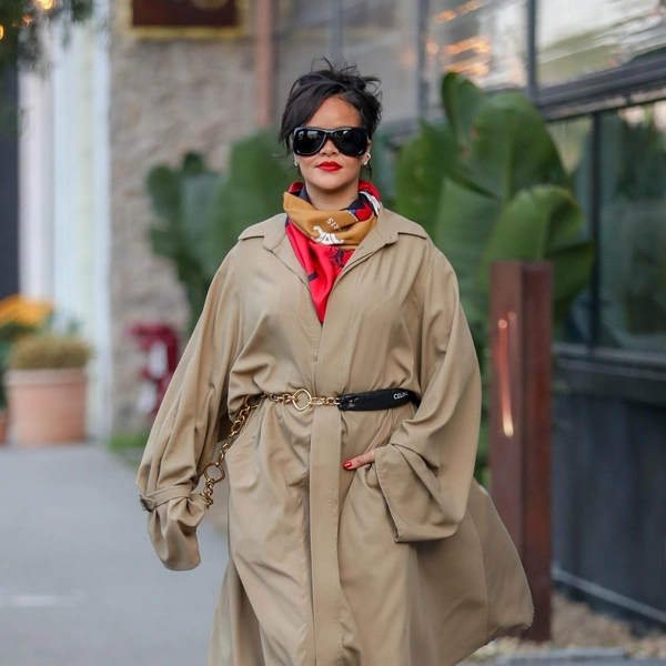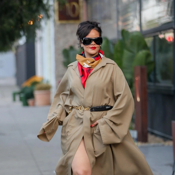Для прогулки Рианна выбрала сложный, но при этом очень собранный образ. Развевающийся бежевый плащ с экстремальным разрезом красиво обнажал ноги, придавая образу кинематографичности. Черный комбинированный пояс, затянутый на талии, придал силуэту четкость, а яркий шелковый платок на шее добавил мягкий цветовой акцент и настроил лук на более утонченную волну.