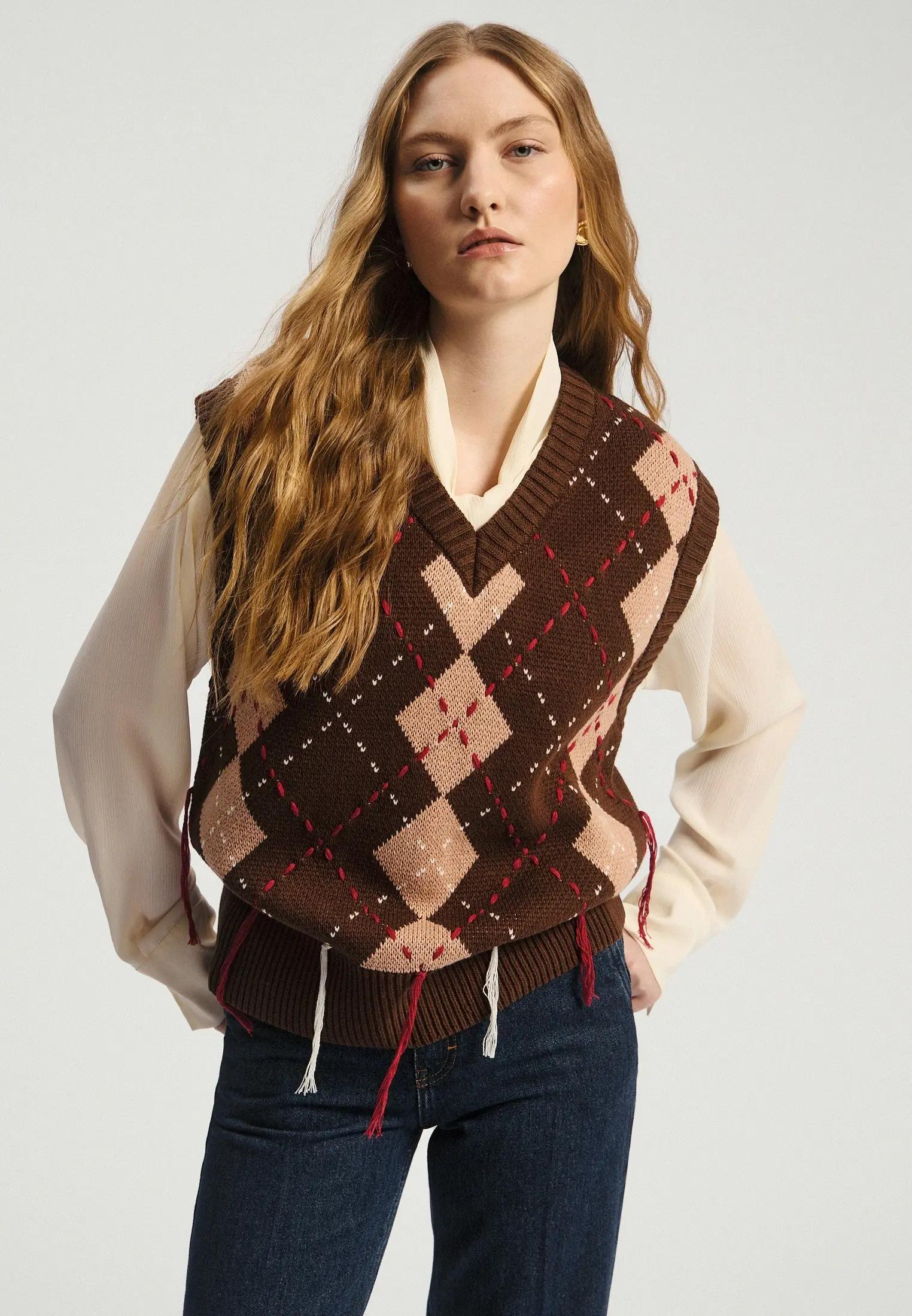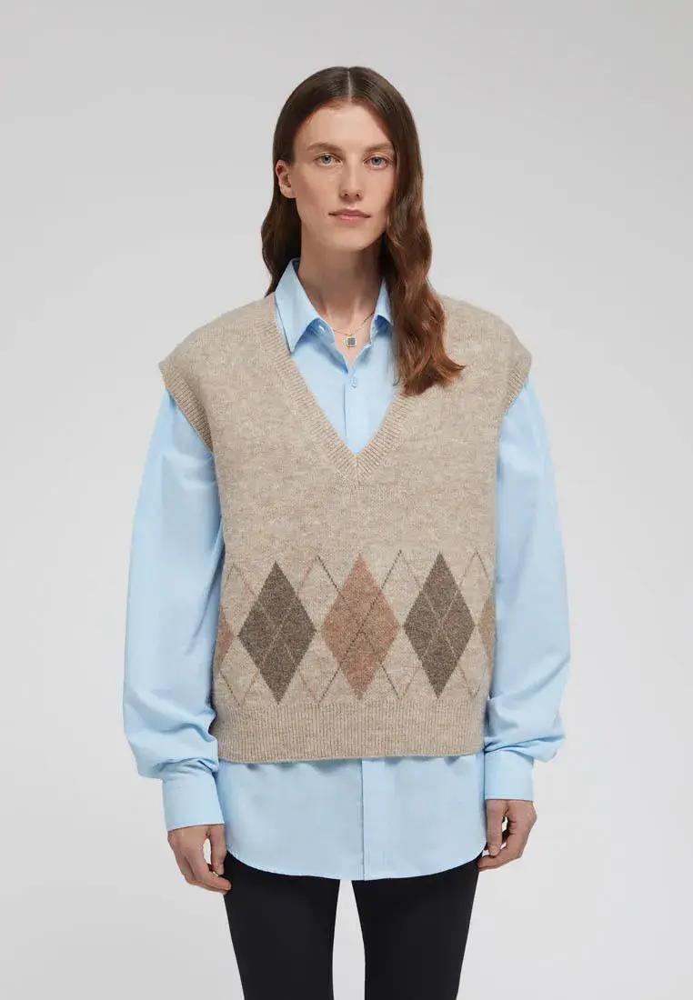 Аргайл снова в центре внимания. Его геометрические ромбы создают настроение старой университетской моды, которая идеально вписывается в преппи-стиль. Такой жилет работает сам за себя: даже если надеть его с простой белой рубашкой и темными брюками, образ получится продуманным и выразительным. Аргайл особенно хорош для тех, кто любит графичные узоры и легкое ретро-настроение.