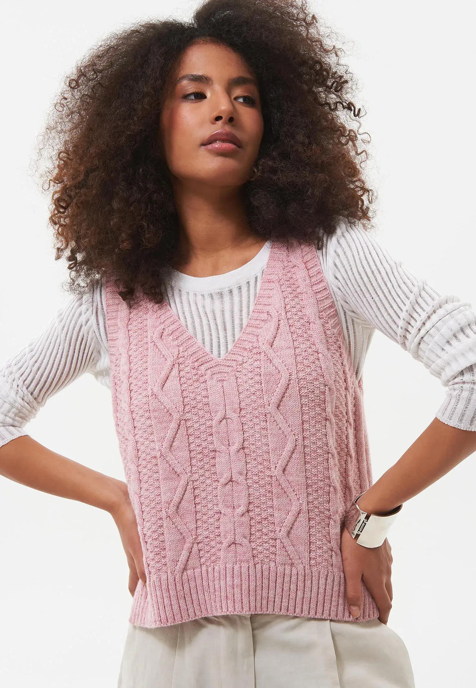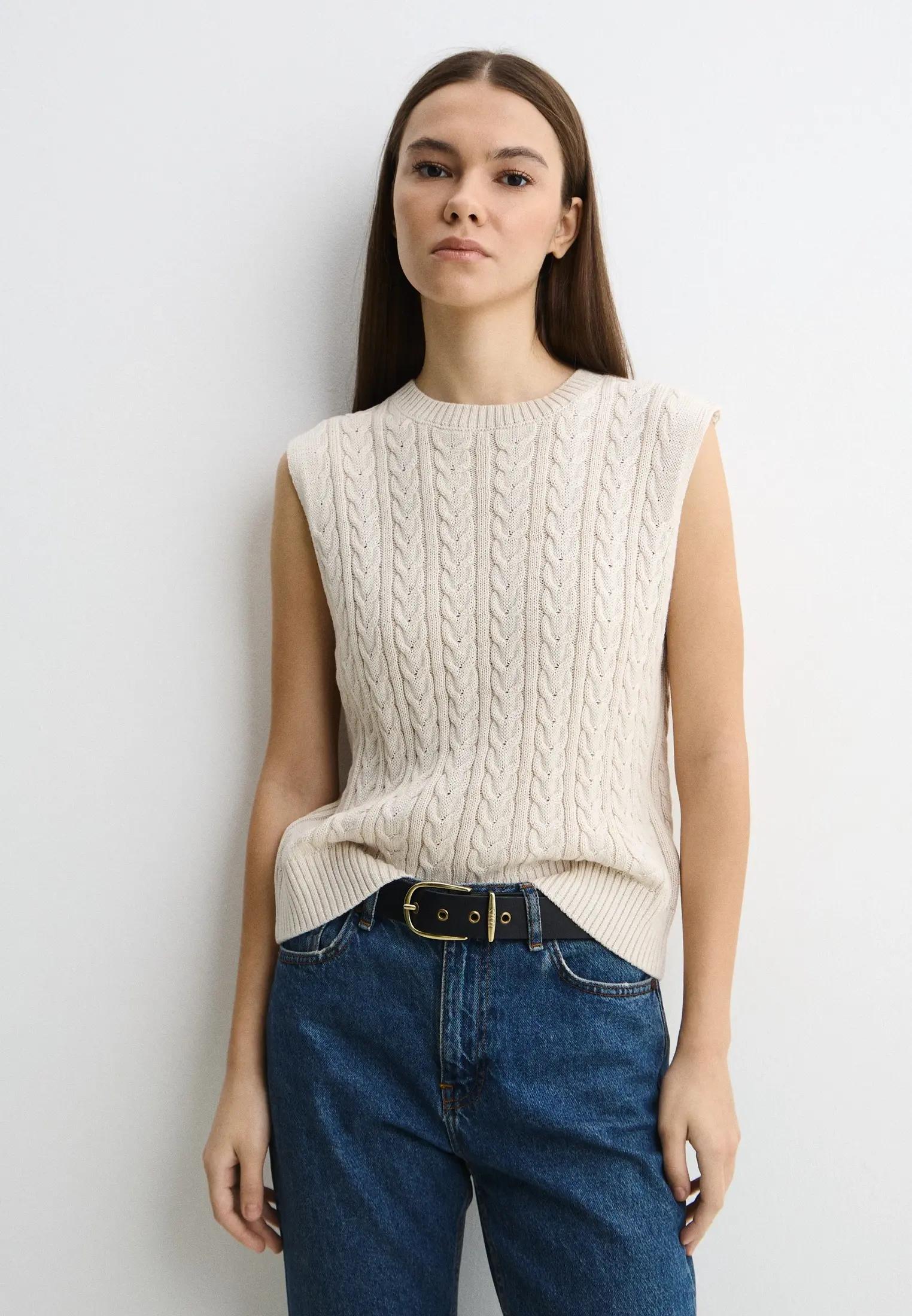 Косы — безусловный хит этого сезона. Будь то мелкие или крупные узоры, смешанные с другими орнаментами или раскинувшиеся по всей поверхности, такие жилеты выглядят особенно выразительно и уютно. Они придают образу глубину, подчеркивают объем трикотажного изделия и создают ощущение волшебной зимней атмосферы ✨