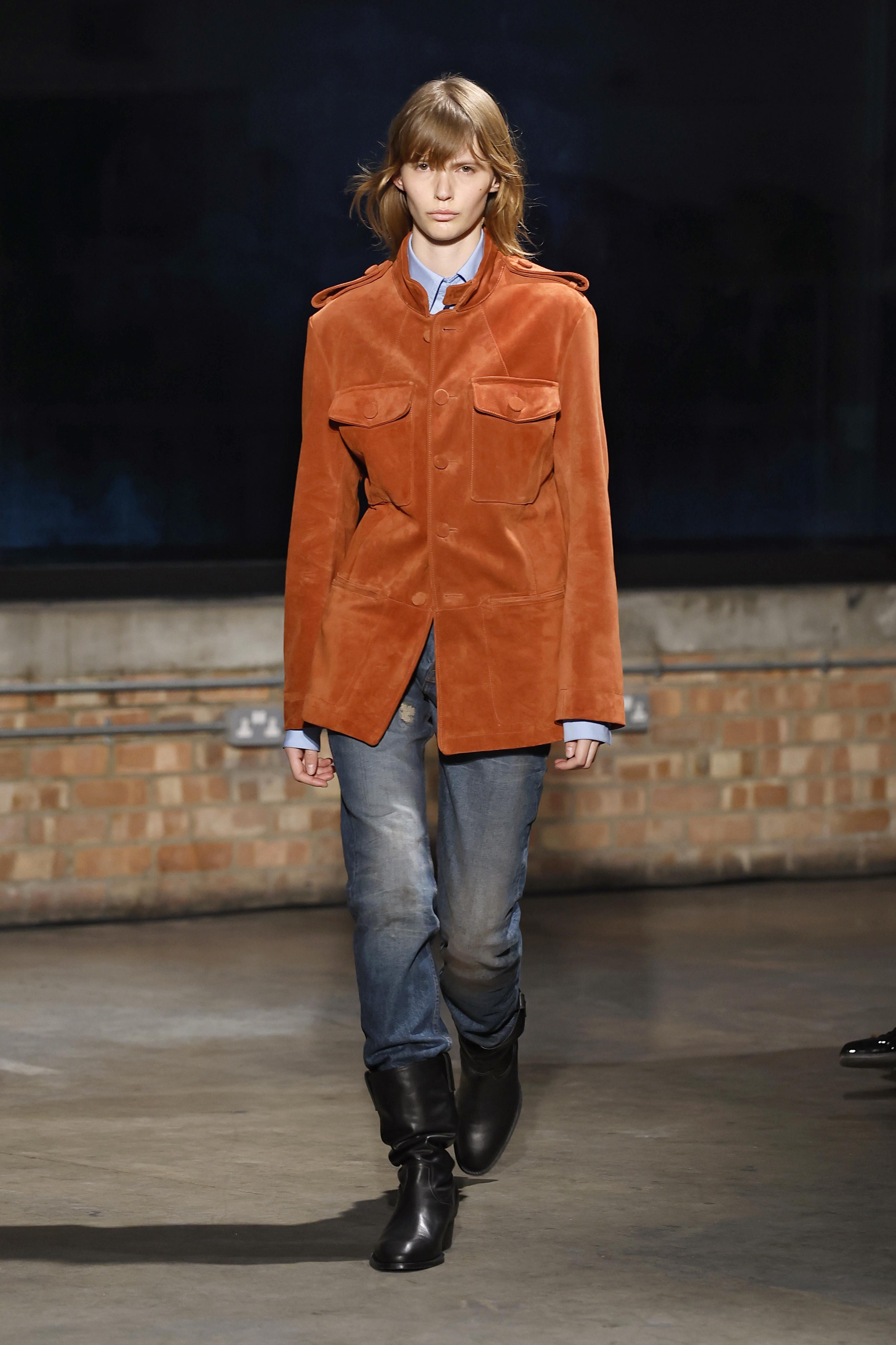 Лондонский дизайнер Аарон Эш дополнил свою коллекцию моделями с деликатными потертостями, вдохновленными британской инди-сценой. Эти джинсы выглядят так, будто их носили годами — без нарочитой грубости, но с характером.