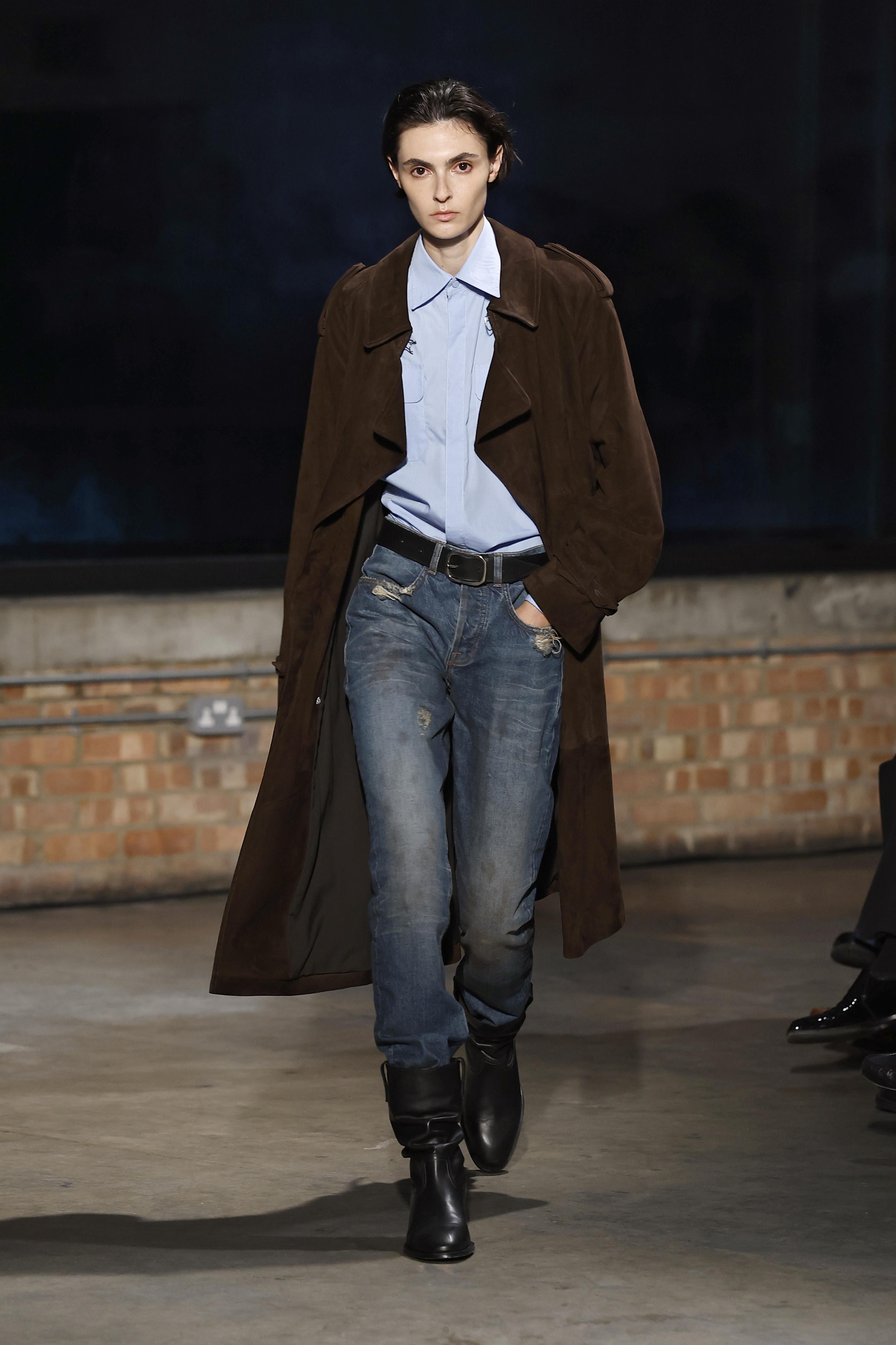 Шон Макгирр для McQueen пошел в сторону прямых отсылок к эпохе y2k: очень низкая посадка, расслабленный силуэт и приглушенный выцветший эффект. Это не копия нулевых, а их взрослая версия — без подростковой демонстративности, но с тем же ощущением свободы.