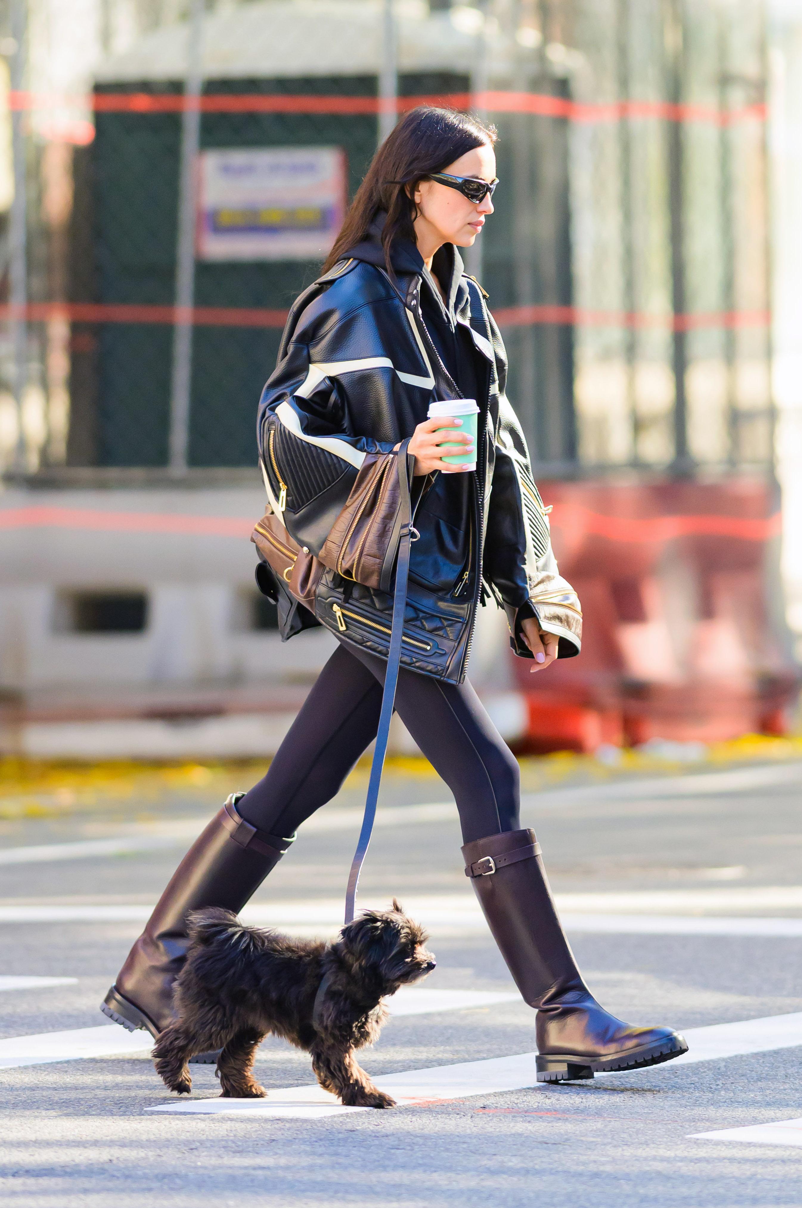 На ней — черные легинсы, объемная кожаная куртка с акцентными молниями и отделкой в байкерском стиле. В руках — стаканчик кофе и стильный черный поводок, по всей длине урашенный металлическими клепками, на котором она вела свою любимую маленькую черную собачку Арахиса. Весь образ — в насыщенной палитре черного и темно-коричневого, где бордовые сапоги становятся не просто обувью, а цветовым акцентом, оживляющим строгий монохром.